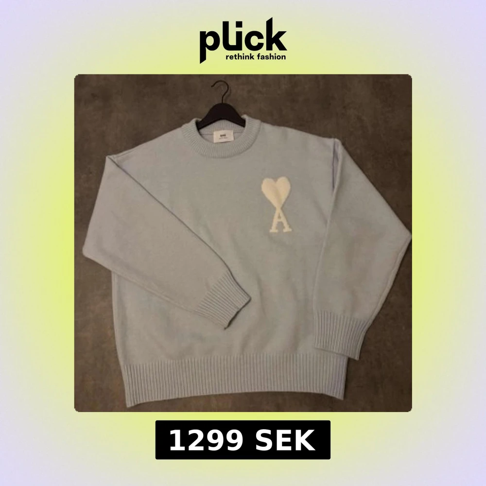 Säljer en stilren ljusblå stickad tröja från Ami med ett vitt hjärtmönster och bokstaven A på bröstet. Tröjan har långa ärmar och ribbade muddar vid ärmslut och nederkant. Perfekt för en avslappnad och trendig look. Storleken är M men passar även som L.