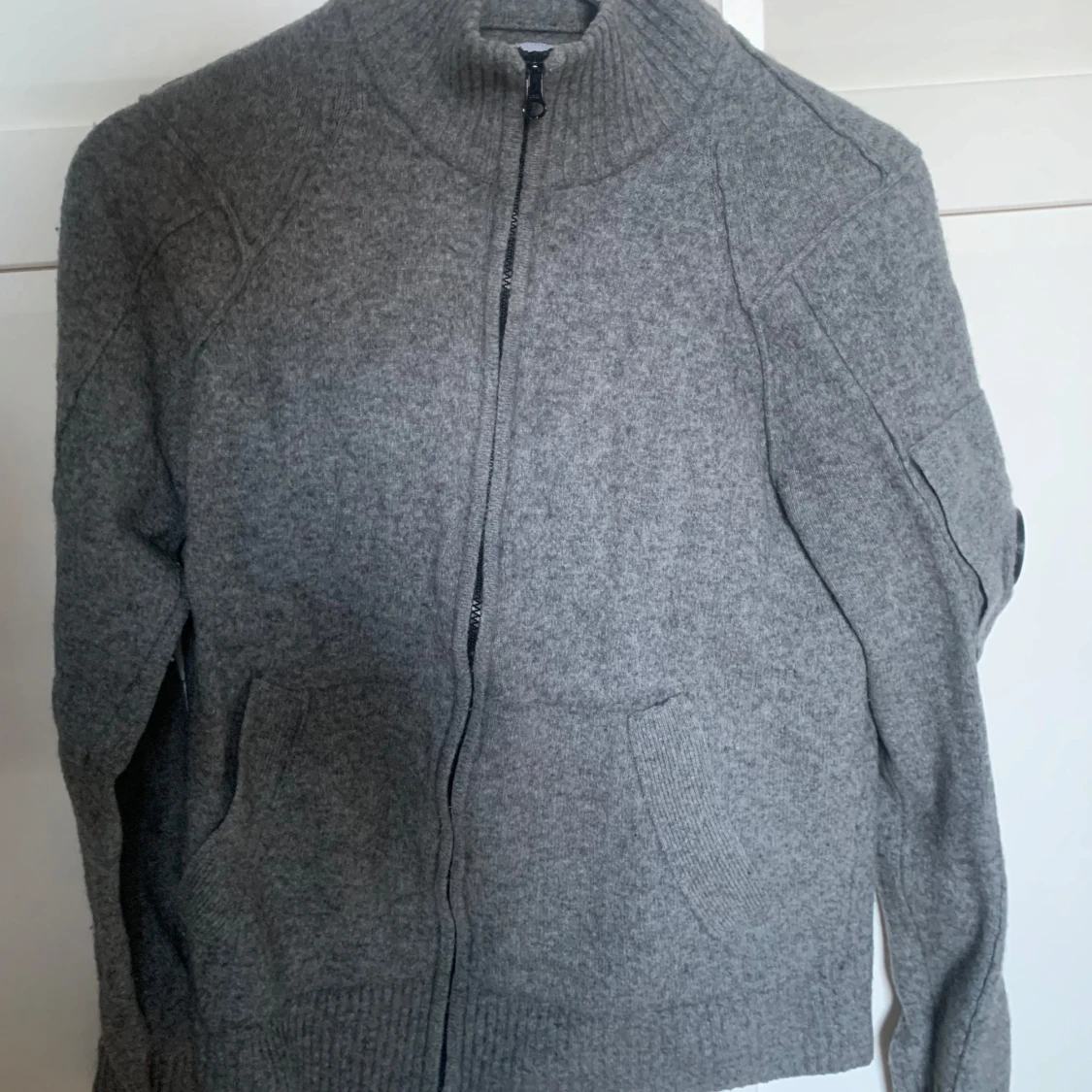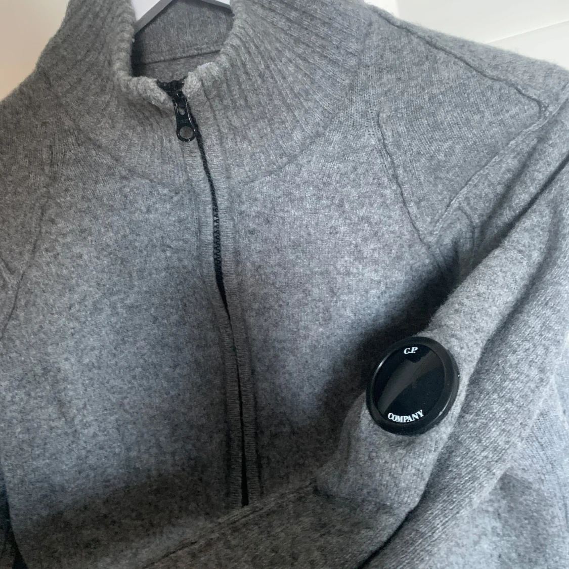 Säljer en stilren grå stickad tröja från C.P. Company med dragkedja framtill. Tröjan har långa ärmar och en ribbad krage samt muddar. Perfekt för kyligare dagar.