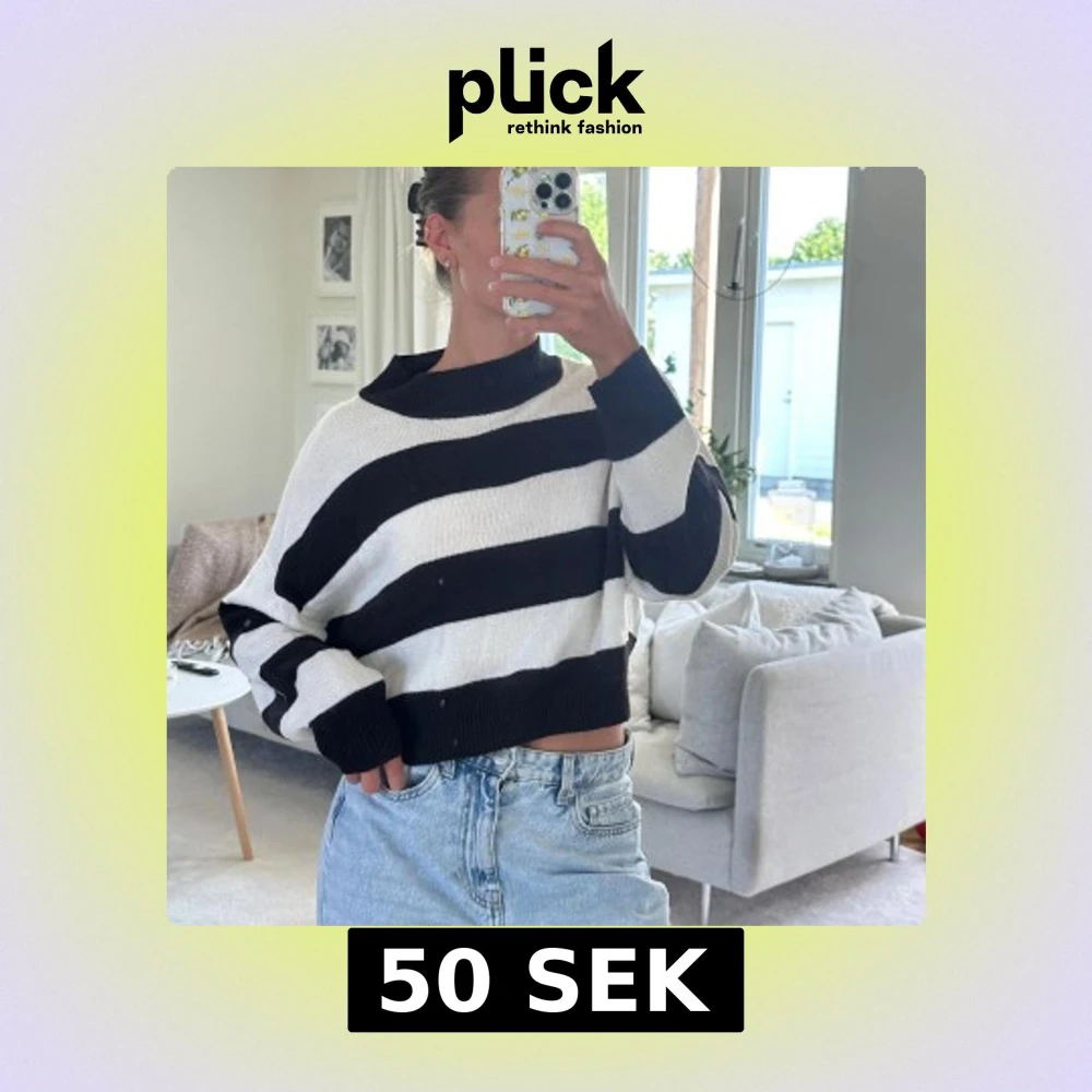 Säljer en svartvit, grovt stickad tröja från Divided med breda ränder och avslappnad passform. Tröjan har lång ärm, ribbade muddar och en lite högre krage.