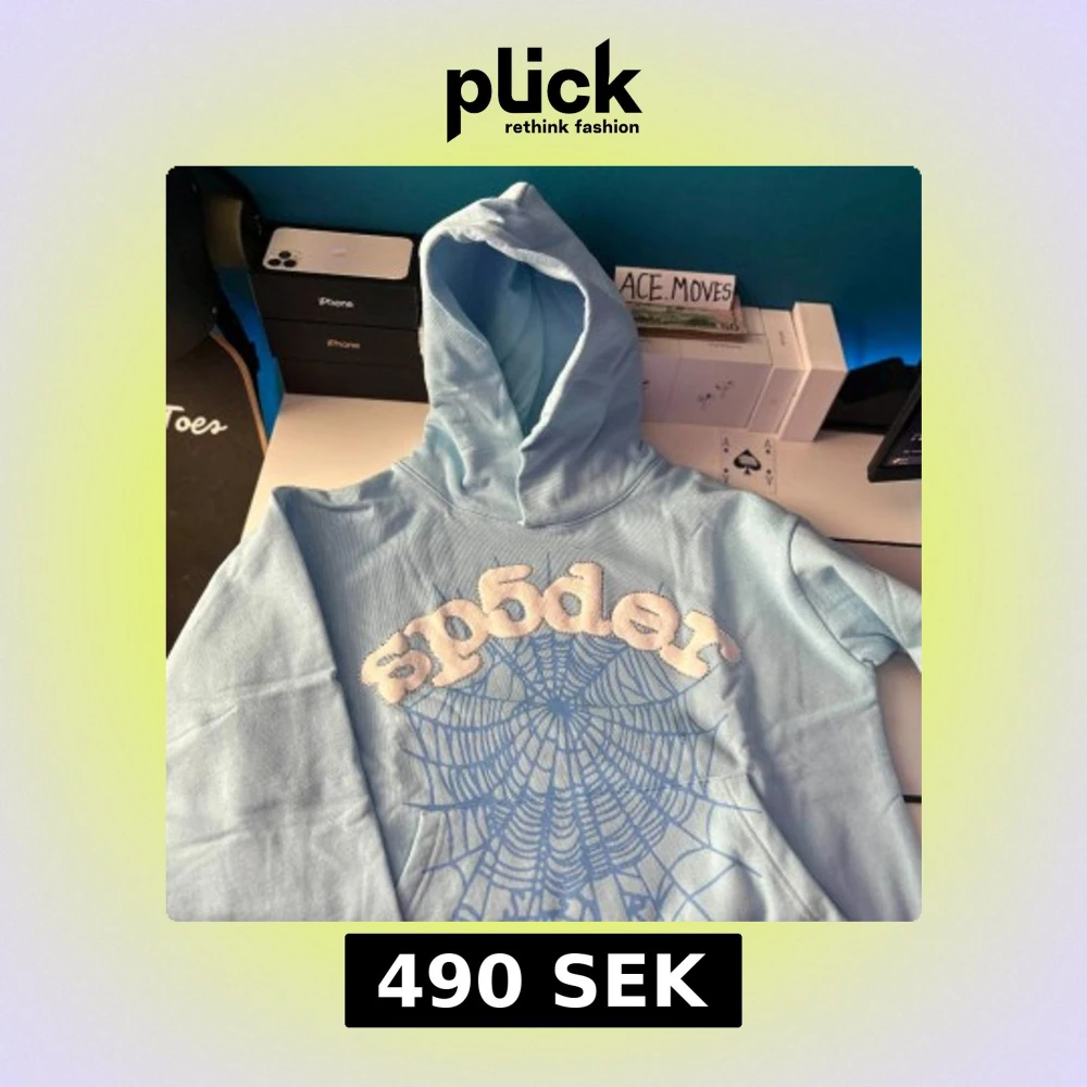 Säljer en ljusblå hoodie från Sp5der i bomull. Tröjan har huva, stort vitt Sp5der-tryck med strassdetaljer och blått spindelnätsmönster på bröstet. Perfekt för dig som gillar streetwear och vill sticka ut med coola detaljer.