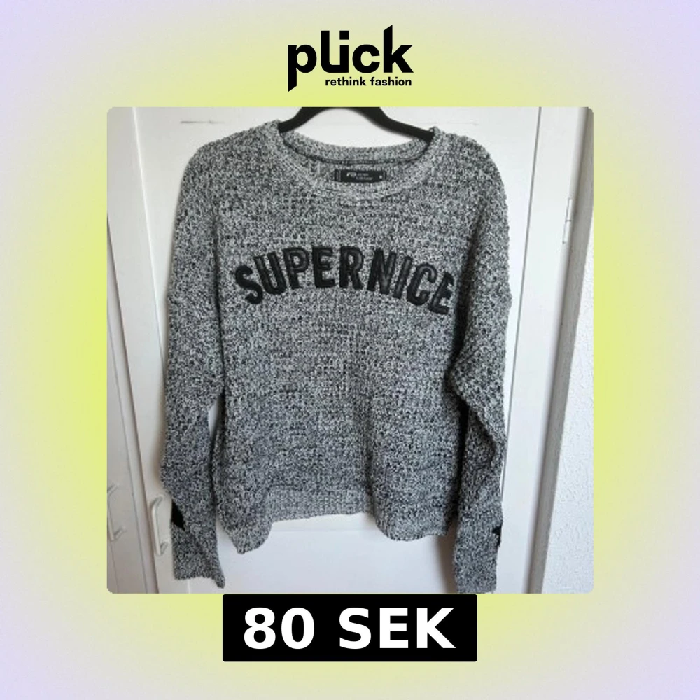 Säljer en gråmelerad stickad tröja från FB Sister med texten 'SUPERNICE' i svart framtill. Tröjan har lång ärm och coola svarta detaljer på ärmarna. Perfekt för dig som gillar en avslappnad och trendig stil.