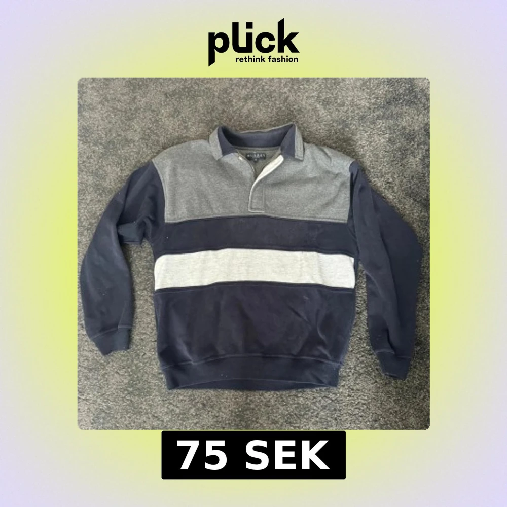 Säljer en klassisk pikétröja från Murrey med breda ränder i mörkblått och två nyanser av grått. Tröjan har lång ärm, krage och knäppning vid halsen. Perfekt för en avslappnad stil.