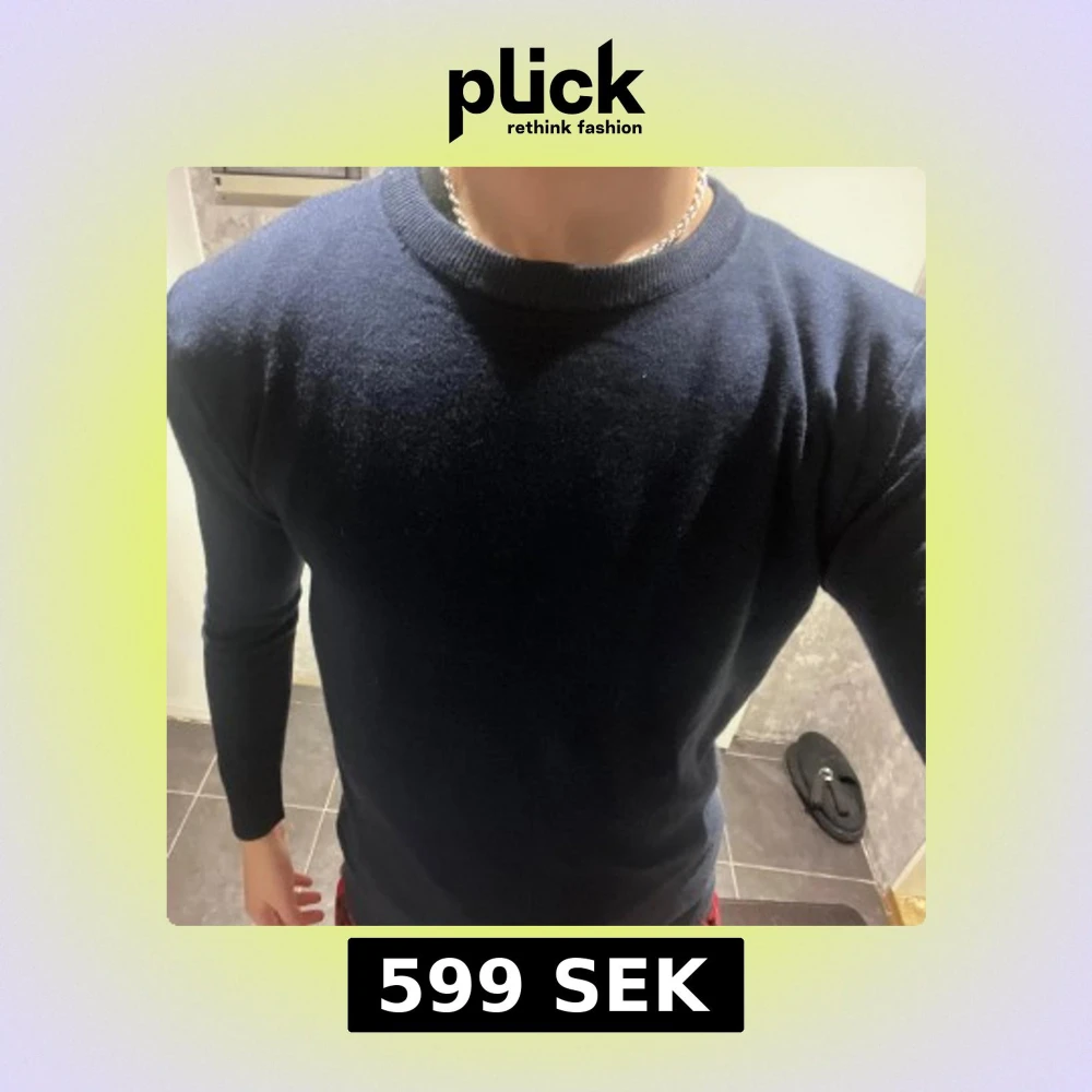 Säljer en stilren mörkblå tröja med rund halsringning. Ull som material och sitter bra på m/s