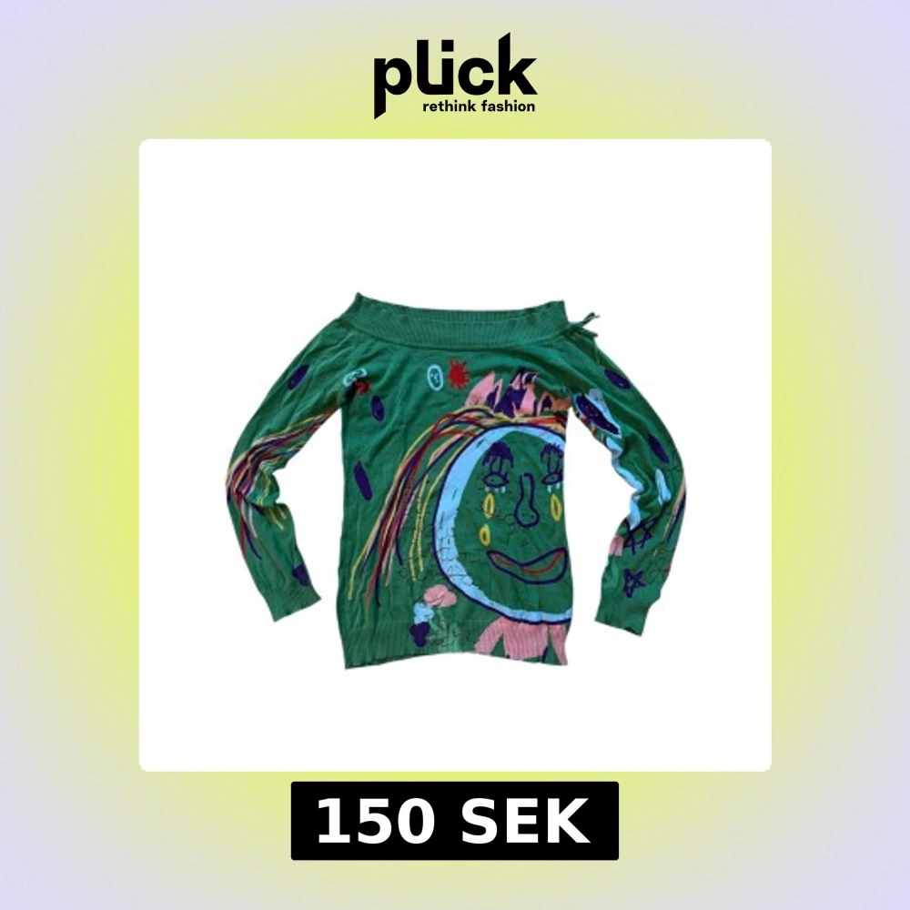 Unik grön tröja med offshoulder-modell och färgglatt konstnärligt tryck framtill. Tröjan har långa ärmar och coola detaljer i lila, rosa, blått och gult. Perfekt för dig som vill sticka ut med en kreativ och lekfull stil.