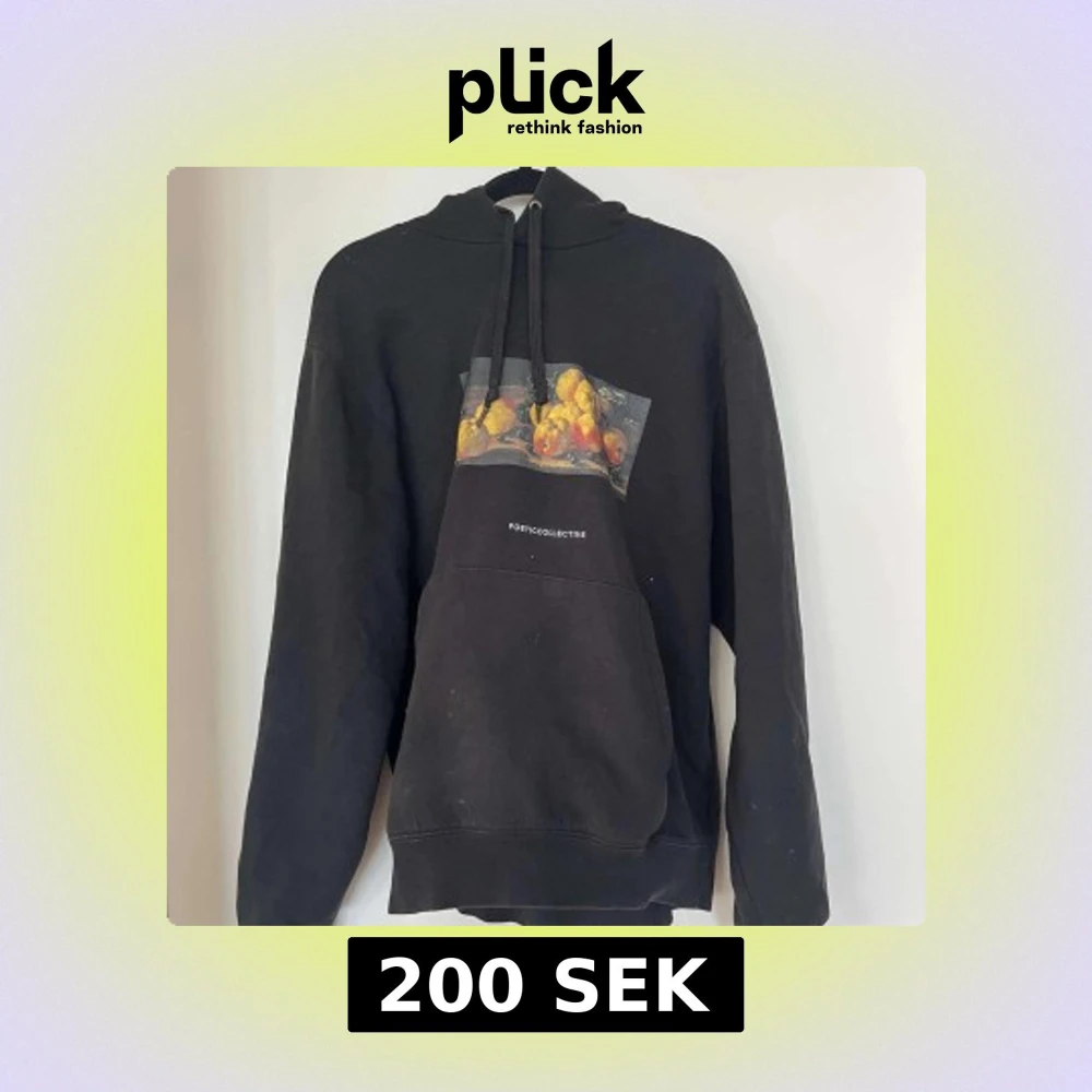 Svart hoodie från Poetic Collective med konstnärligt fruktmotiv på bröstet och vit logga. Klassisk känguruficka, huva med snörning och mjukt material. Perfekt för dig som gillar streetwear med en artsy twist.