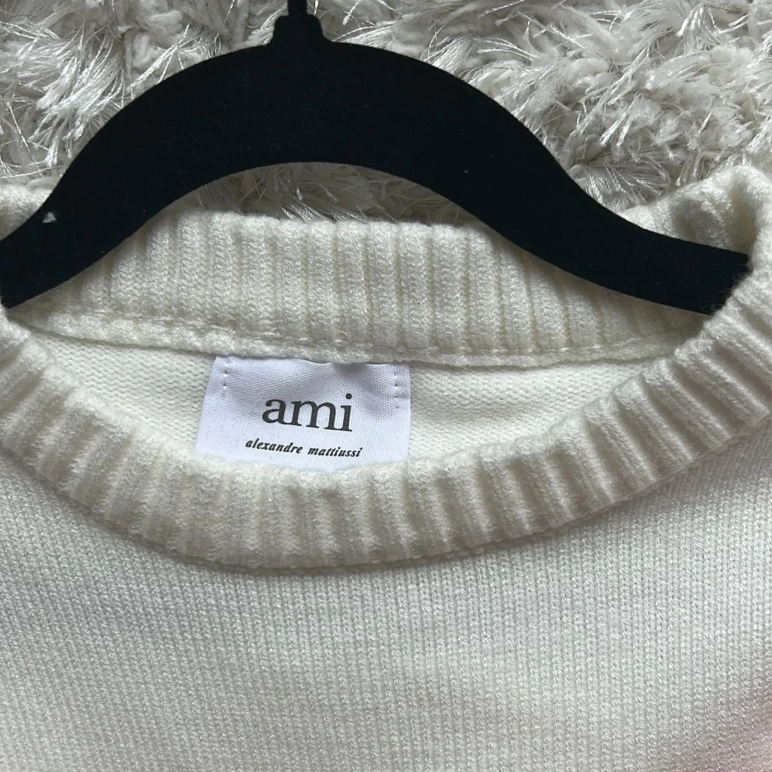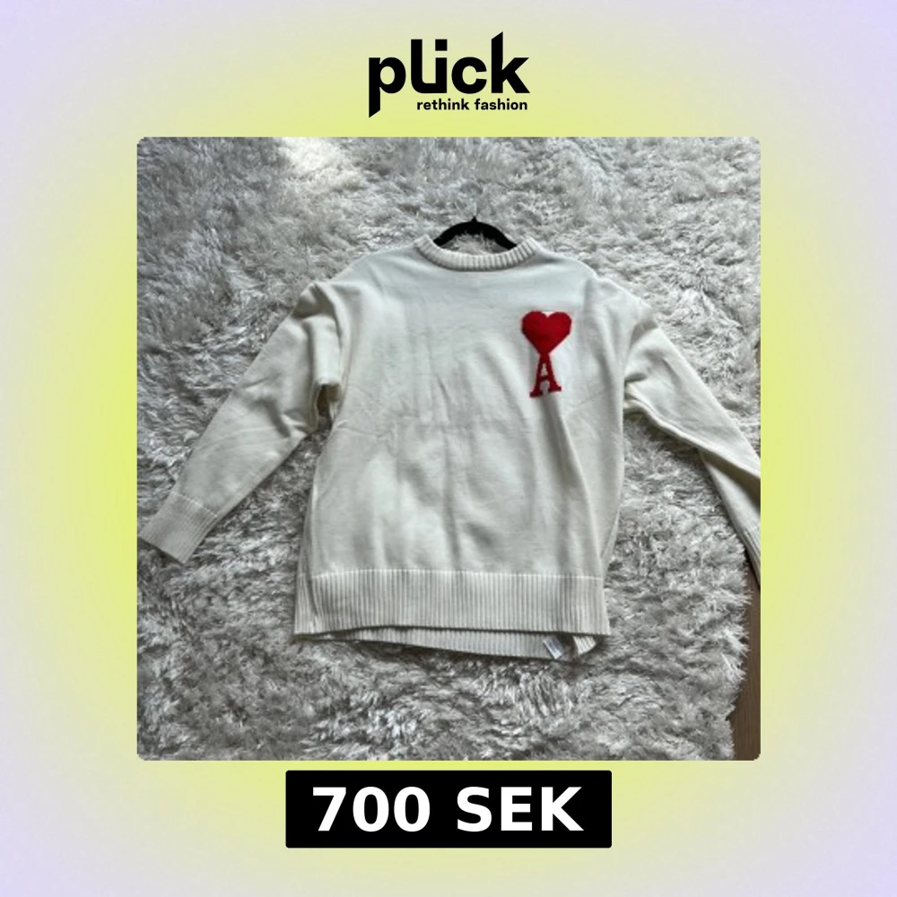 Säljer en stilren vit stickad tröja från Ami med ett rött hjärta och bokstaven A broderat på bröstet. Tröjan har rund halsringning och ribbade muddar vid ärmslut och nederkant. Perfekt för dig som gillar klassisk design med en twist.