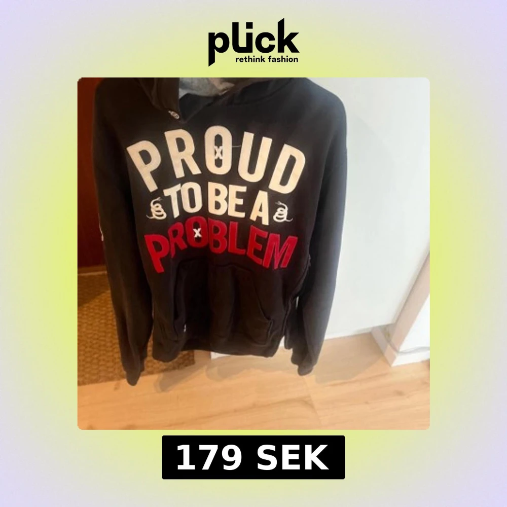 Svart hoodie från 10.Deep i storlek M med stor text 'PROUD TO BE A PROBLEM' i vitt och rött på framsidan. På ärmen finns en broderad tigerpatch i gult, svart och rött. Hoodien har huva och känguruficka, perfekt för dig som gillar streetwear med attityd.
