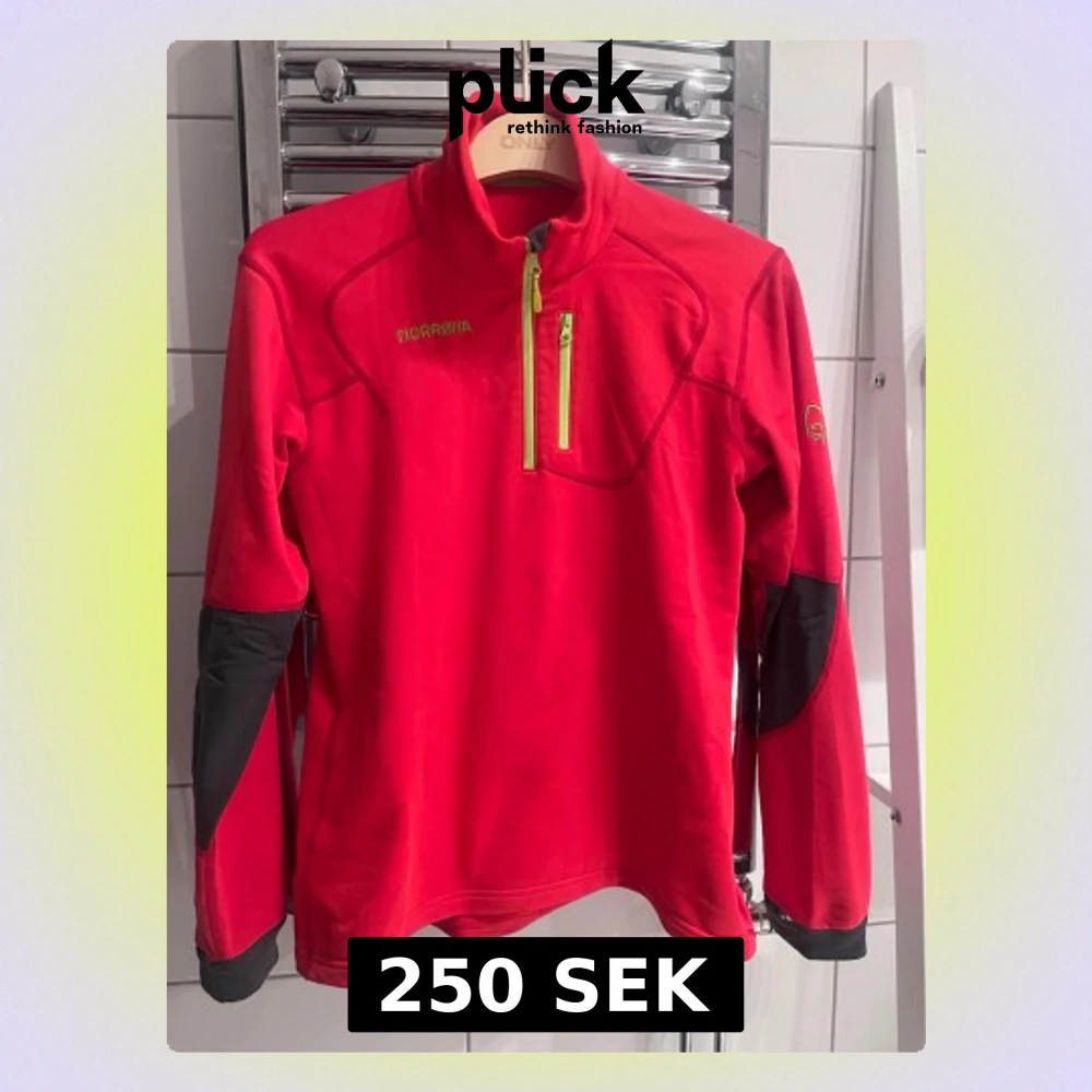 Röd fleece från Norrøna med halv dragkedja och bröstficka med gulgrön dragkedja. Svarta förstärkningar på armbågarna och hög krage. Perfekt för lager-på-lager och outdoor. Broderad logga på bröstet.