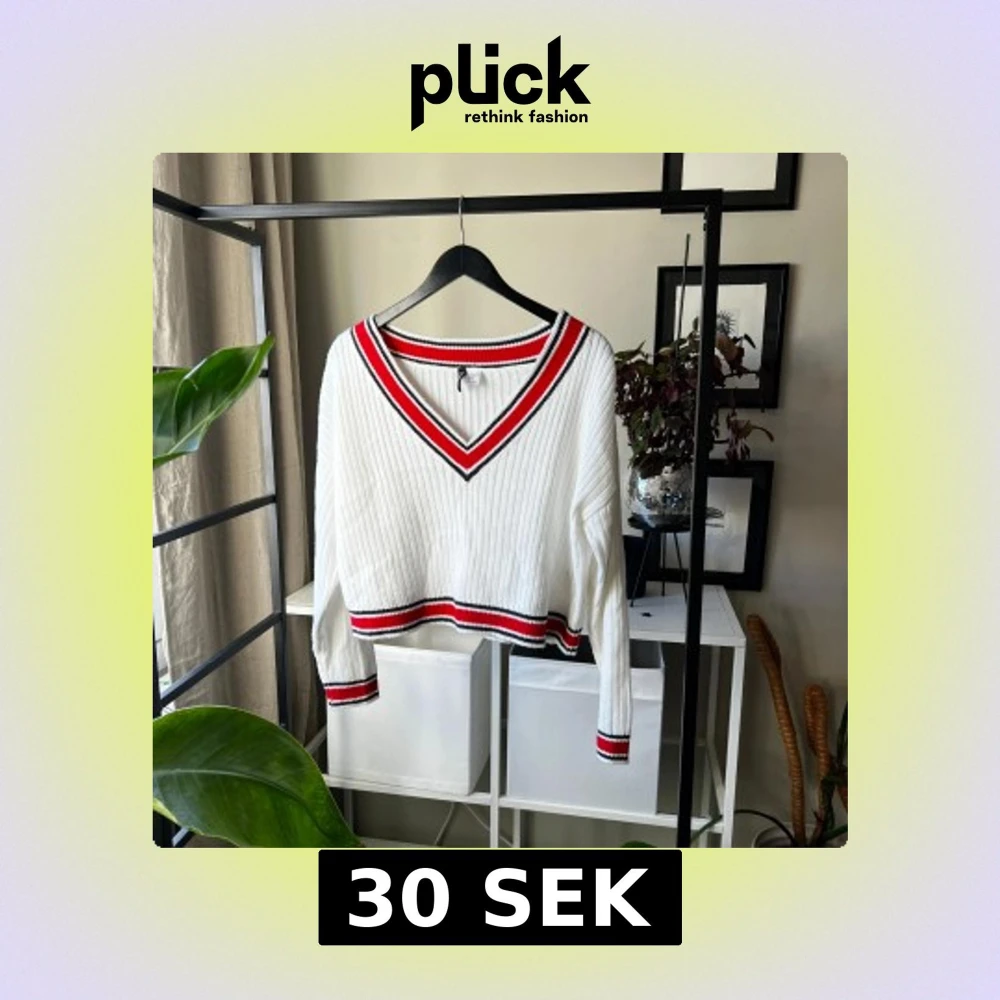 Vit ribbad stickad tröja från Divided med v-ringad hals och sportiga ränder i rött och svart vid hals, ärmslut och nederkant. Croppad modell med lång ärm, perfekt för en chill och trendig look.