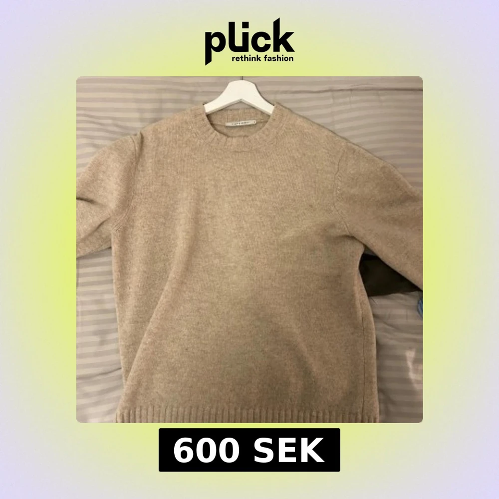 Säljer en stilren beige stickad tröja från A Day's March. Tröjan har en rund halsringning och ribbade muddar vid ärmslut och nederkant. Perfekt för kyligare dagar.