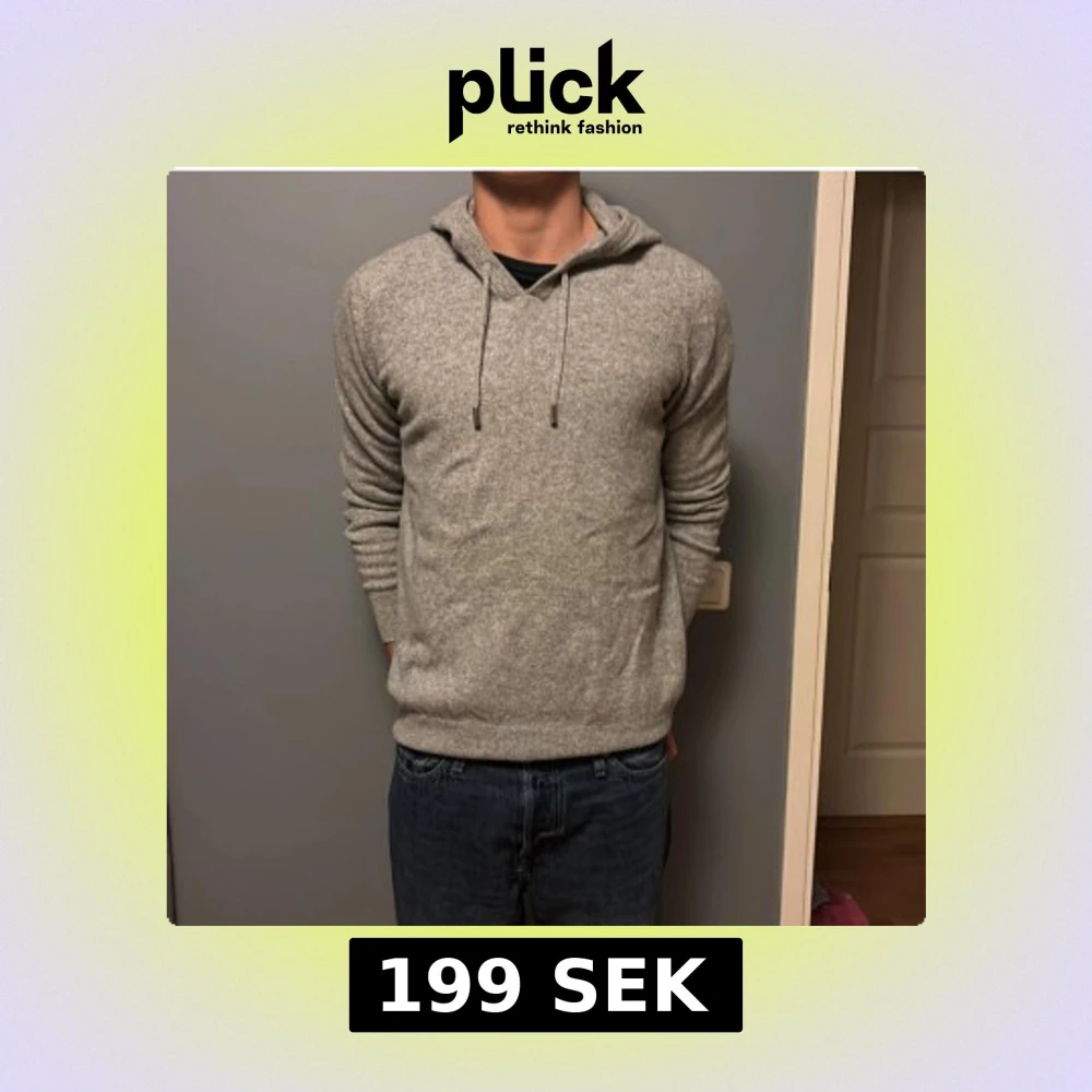 Mysig grå stickad hoodie med huva och snörning. Tröjan har lång ärm och en klassisk passform som funkar till allt. Den är i bra skick då den är använd ett fåtal gånger bara.