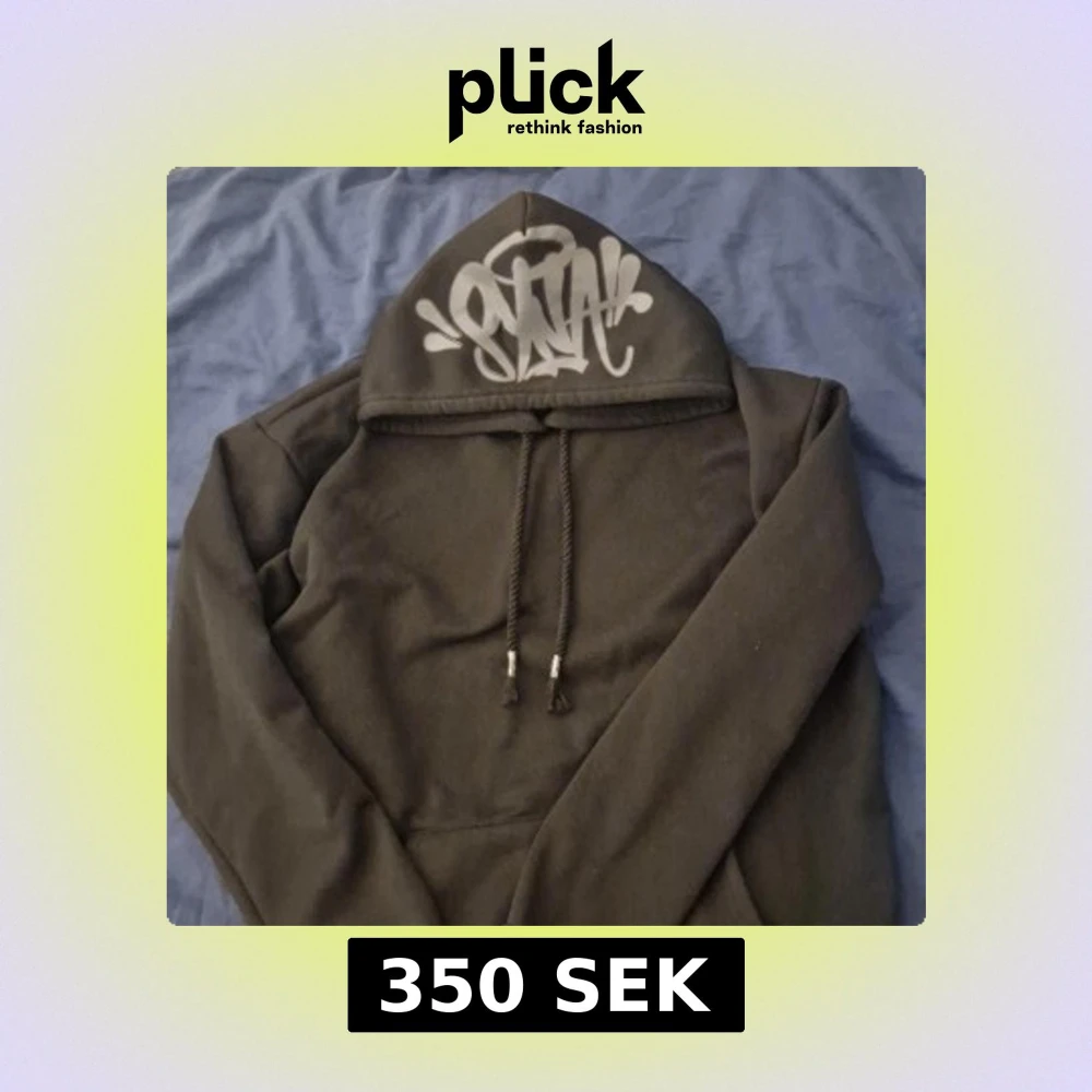 Säljer en syna world svart hoodie med ett coolt tryck på huvan. Den har en justerbar dragsko och långa ärmar. Perfekt för en avslappnad stil. 300 sista pris