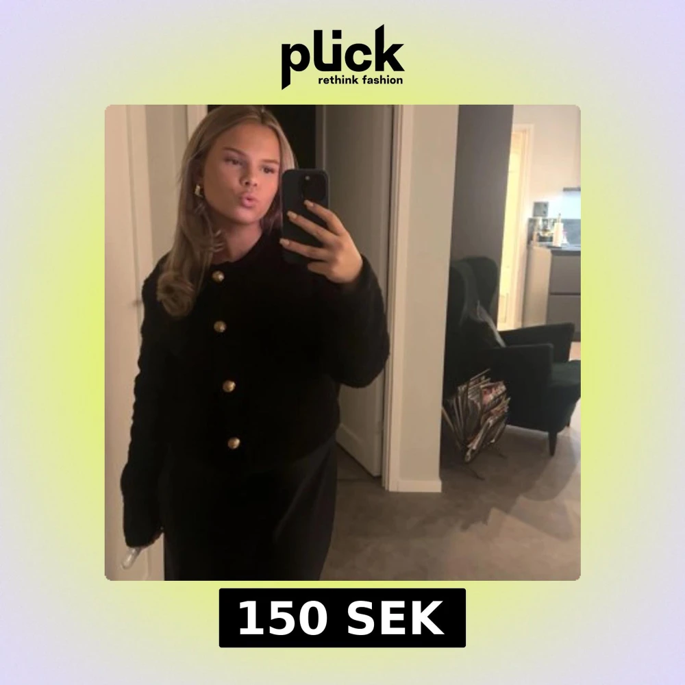 Säljer en svart cardigan jacka med stora guldknappar framtill. Jackan har lång ärm och en klassisk, rak passform. Perfekt för dig som vill ha en stilren och enkel look.