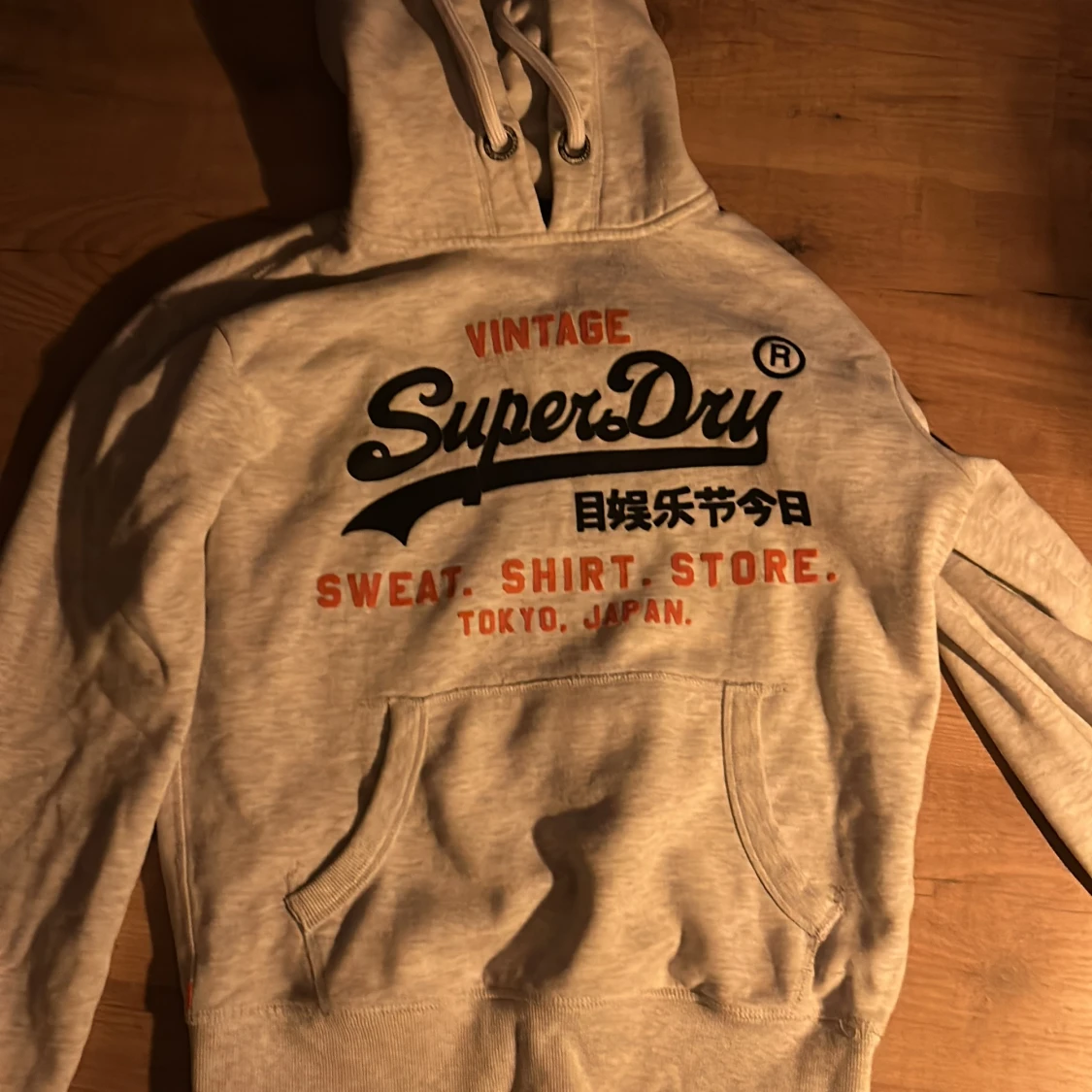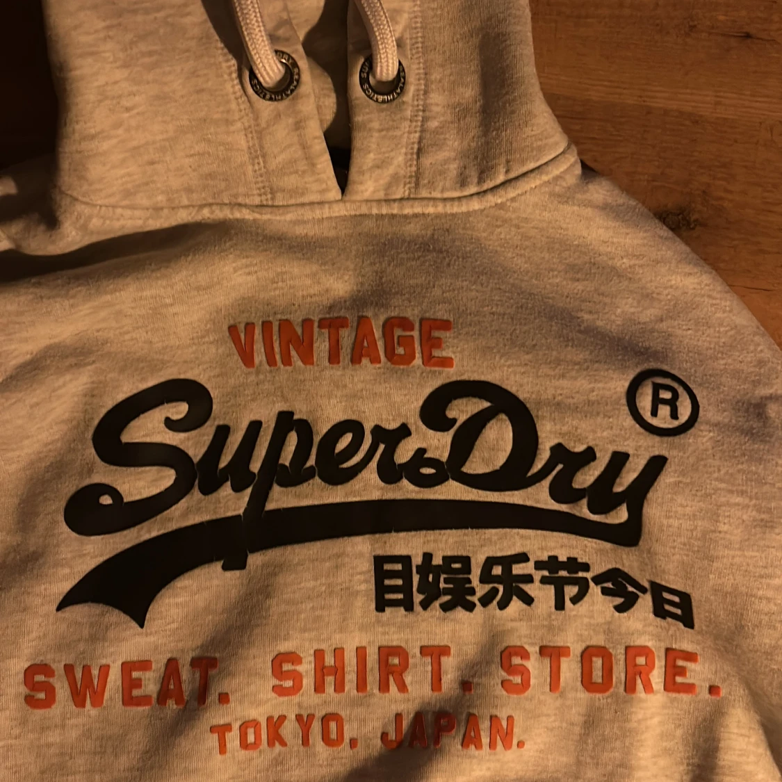 Säljer en grå hoodie från SuperDry med tryck i svart och rött på framsidan. Hoodien har en klassisk design med känguruficka och justerbar huva med snören. Perfekt för en avslappnad stil.