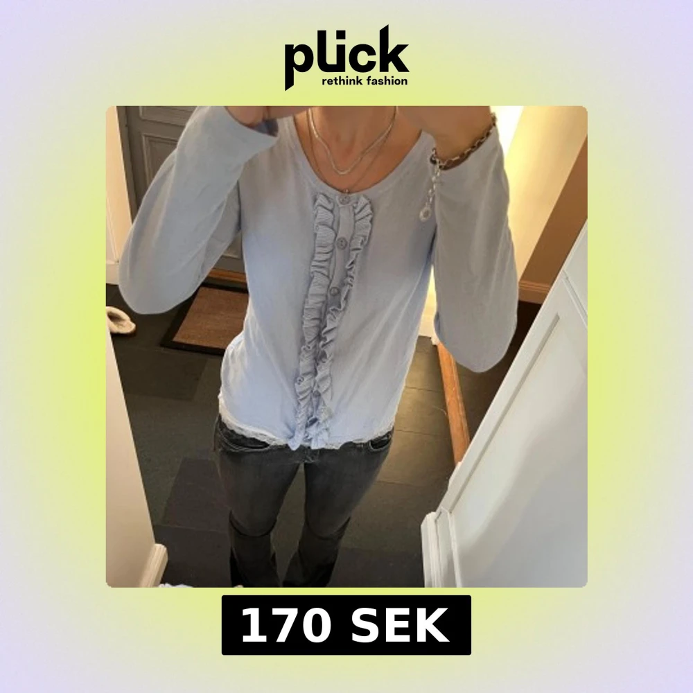 Blå kofta med volanger från Ashley Brooks i storlek 38, skulle säga att den passar S och M. Fint skick. Använd gärna köp nu!