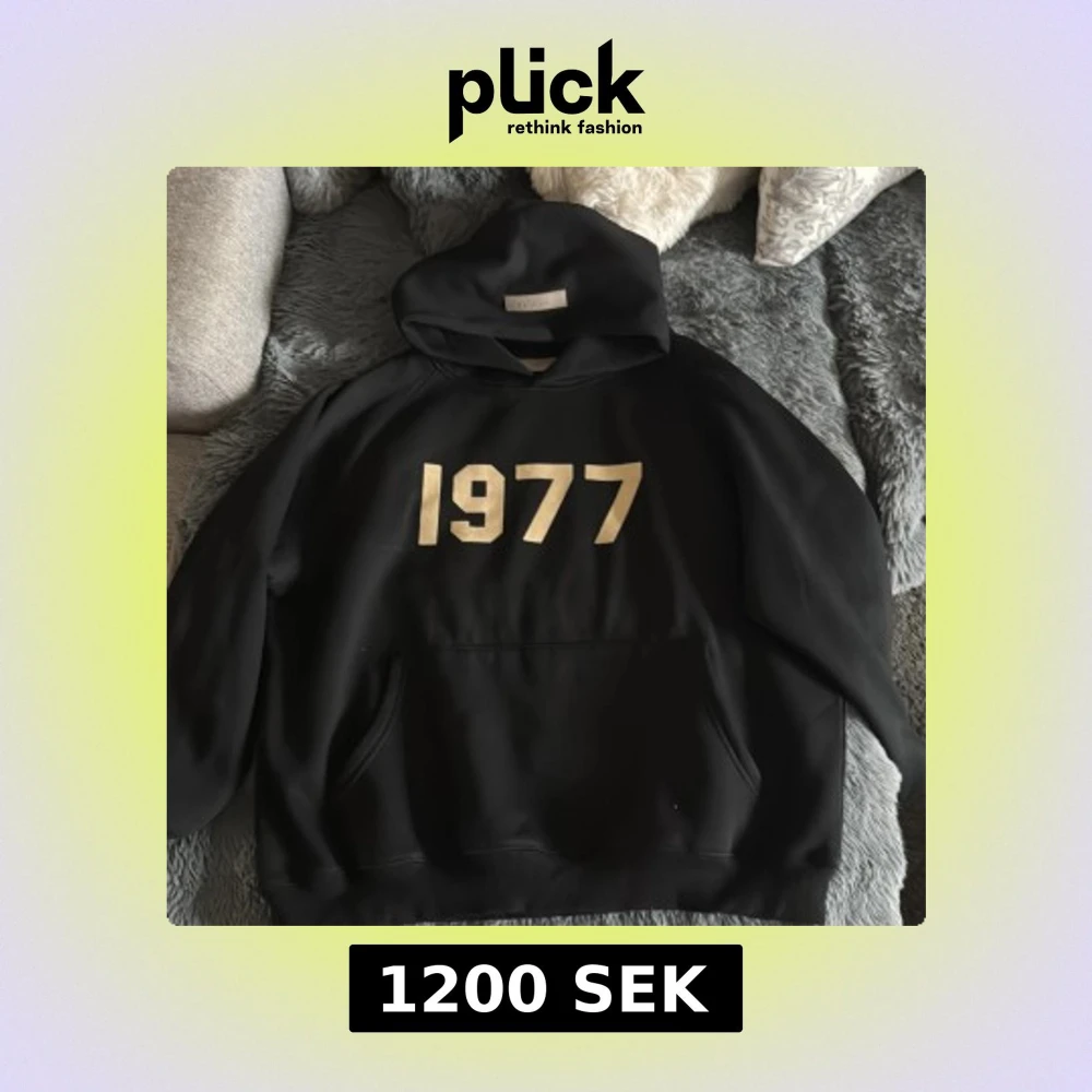 Svart hoodie från Essentials med stor beige 1977-print på bröstet. Klassisk känguruficka framtill, huva och relaxed fit. Perfekt för dig som gillar streetwear och enkel stil. Materialet är mjukt och känns skönt mot huden.