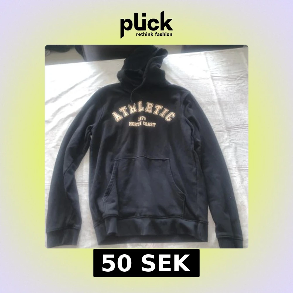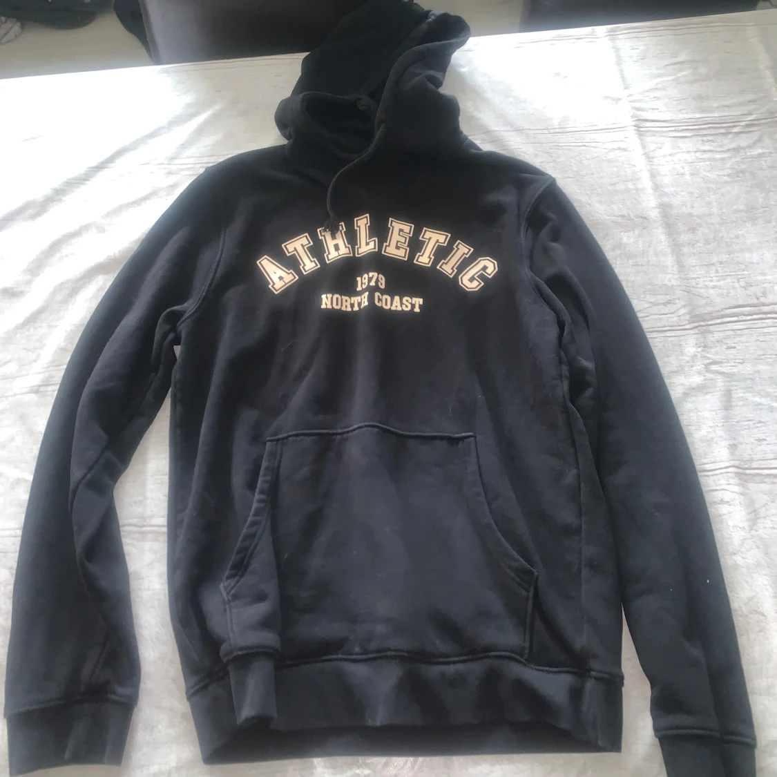 Svart hoodie med stor, mjuk huva och snörning. Framtill står det 'ATHLETIC 1979 NORTH COAST' i beige bokstäver. Tröjan har en klassisk känguruficka och långa ärmar. Perfekt för chill dagar eller när du vill ha en sportig look.