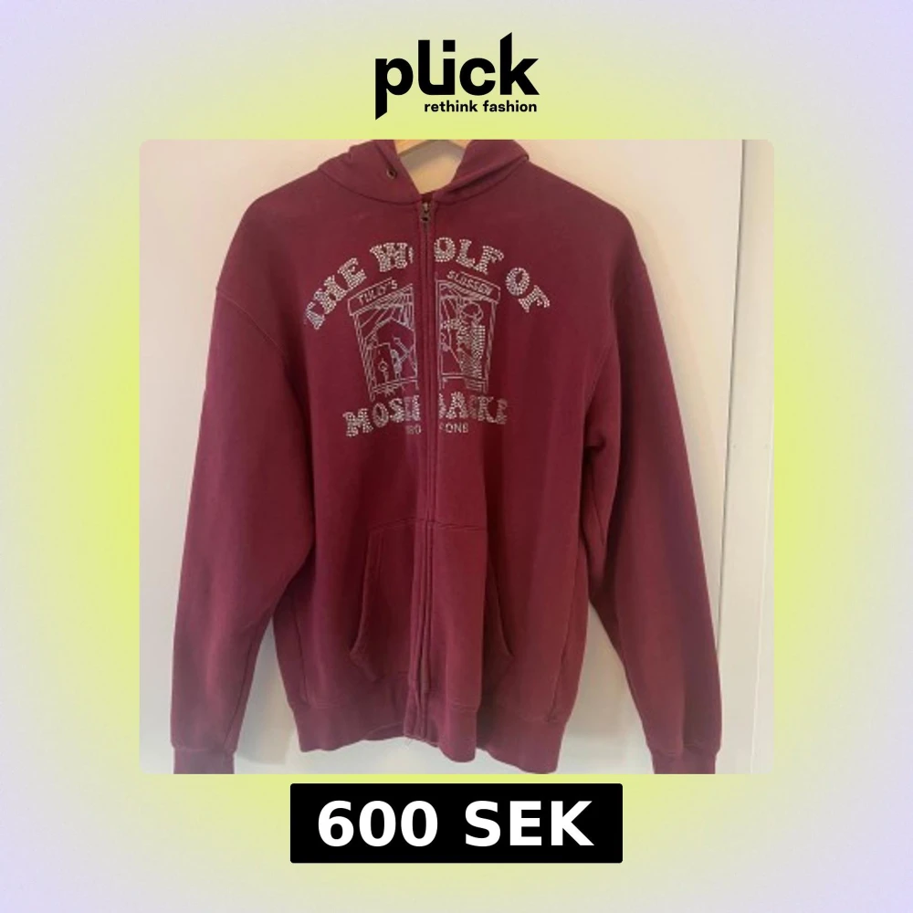 Vinröd hoodie med dragkedja från One of One. Tröjan har huva, fickor framtill och ett tryck med text och motiv på bröstet. Perfekt för en avslappnad stil.