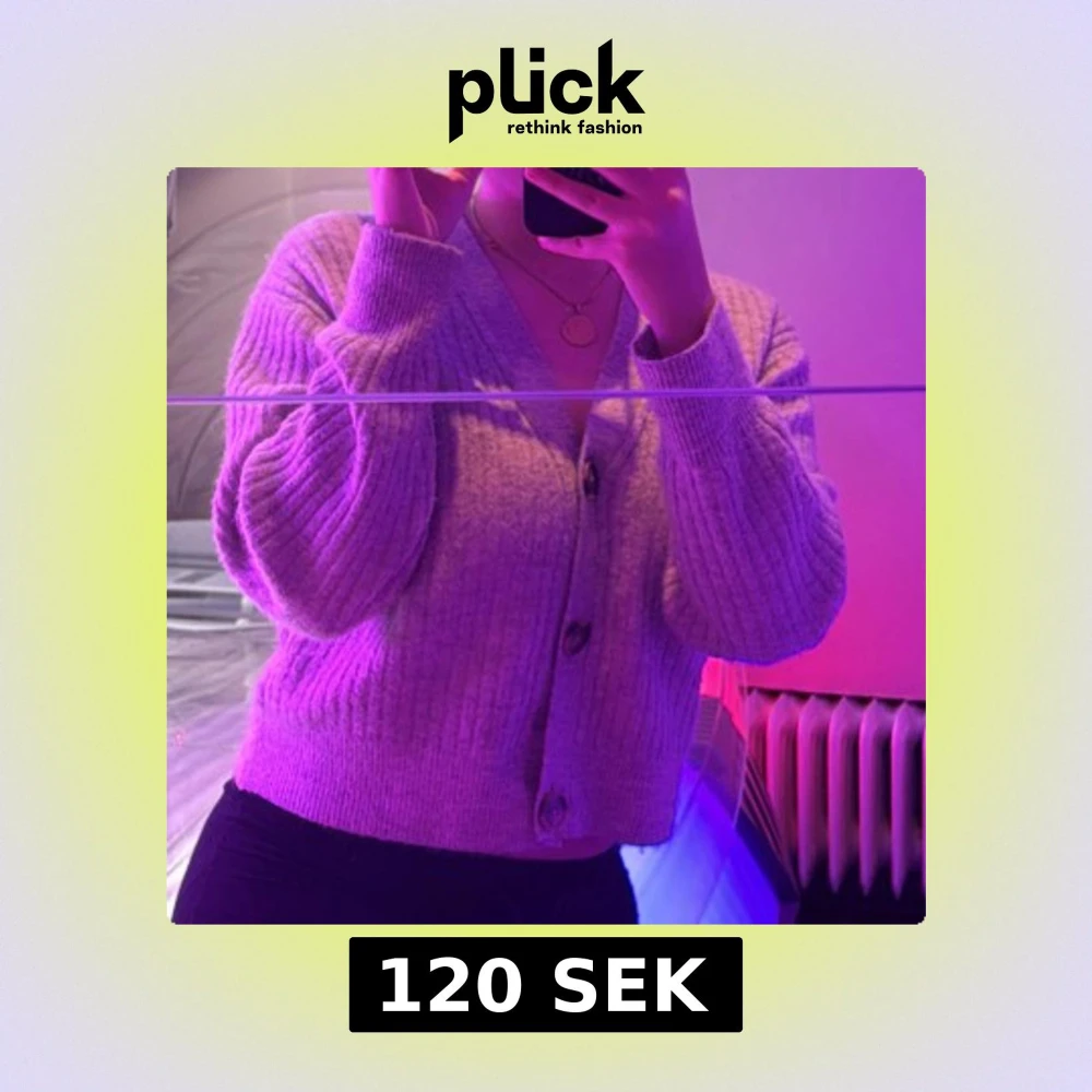 Supermysig ljusgrå kofta med ribbad struktur och stora knappar framtill. Croppad modell med lång ärm och v-ringad hals. Perfekt att slänga på sig när det är kyligt ute.