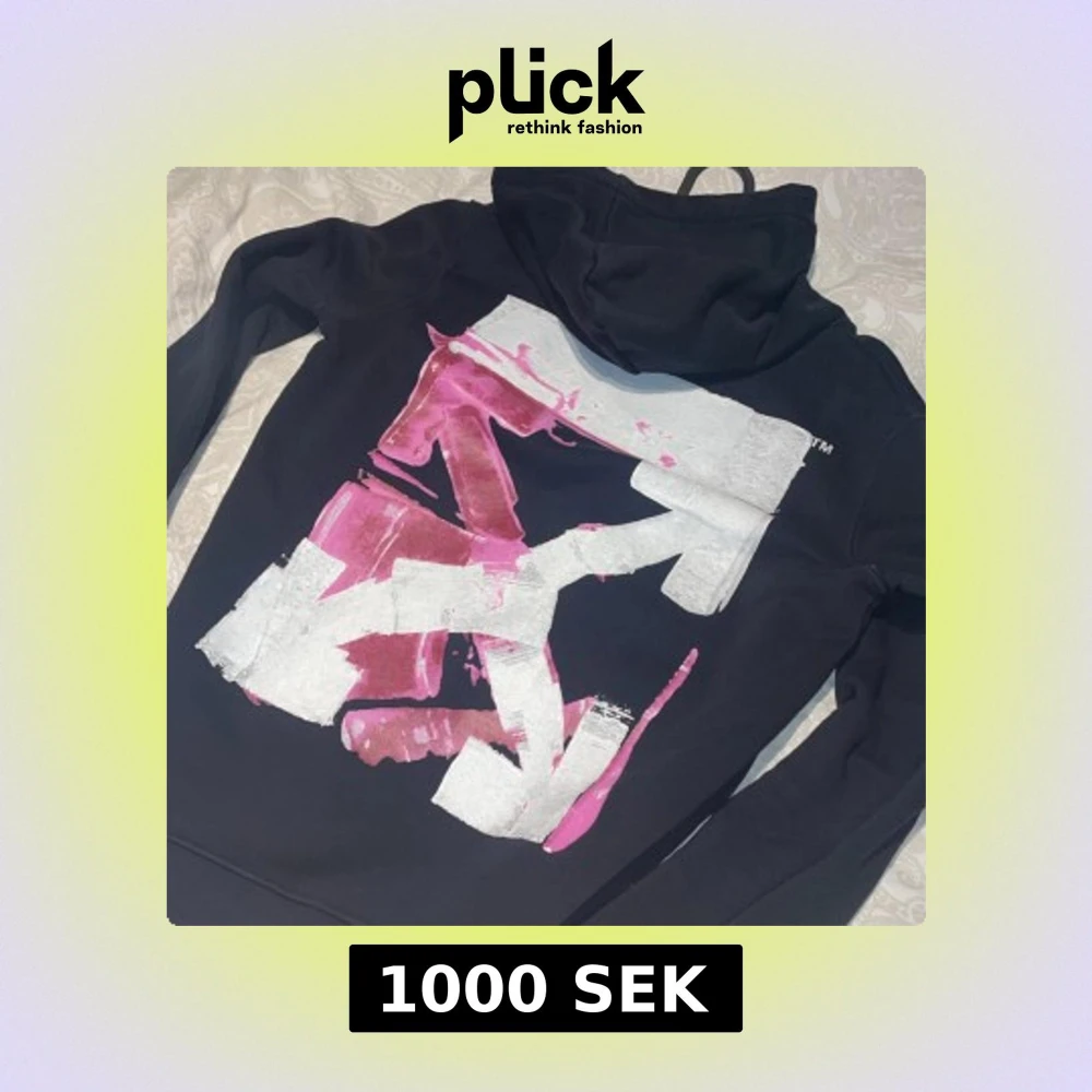 Snygg svart hoodie från Off-White med ett stort grafiskt tryck i rosa och vitt på framsidan. Tröjan har en klassisk huva och långa ärmar. Perfekt för en trendig och avslappnad stil.
