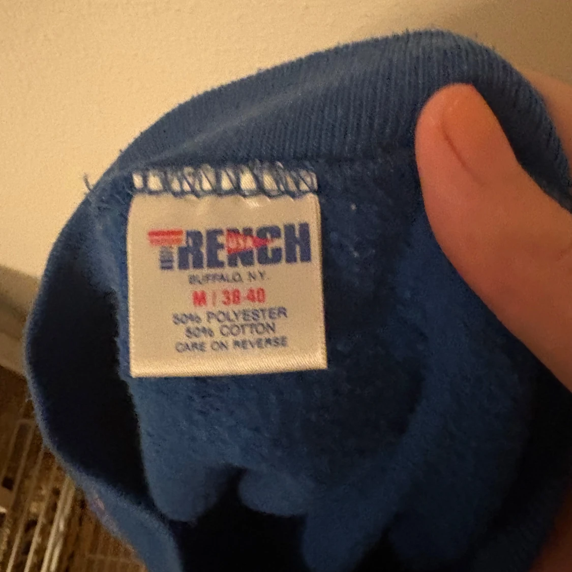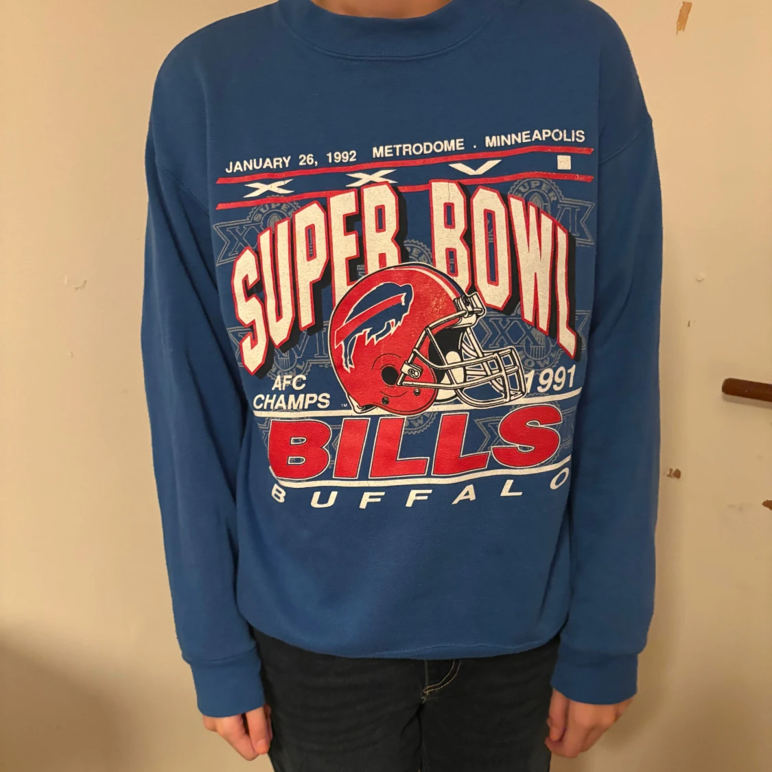 Retro blå crewneck från Trench med stort Buffalo Bills Super Bowl-tryck i rött, vitt och blått framtill. Skön passform med långa ärmar och ribbade muddar. Materialet är en mix av bomull och polyester, perfekt för dig som gillar amerikansk sportstil.