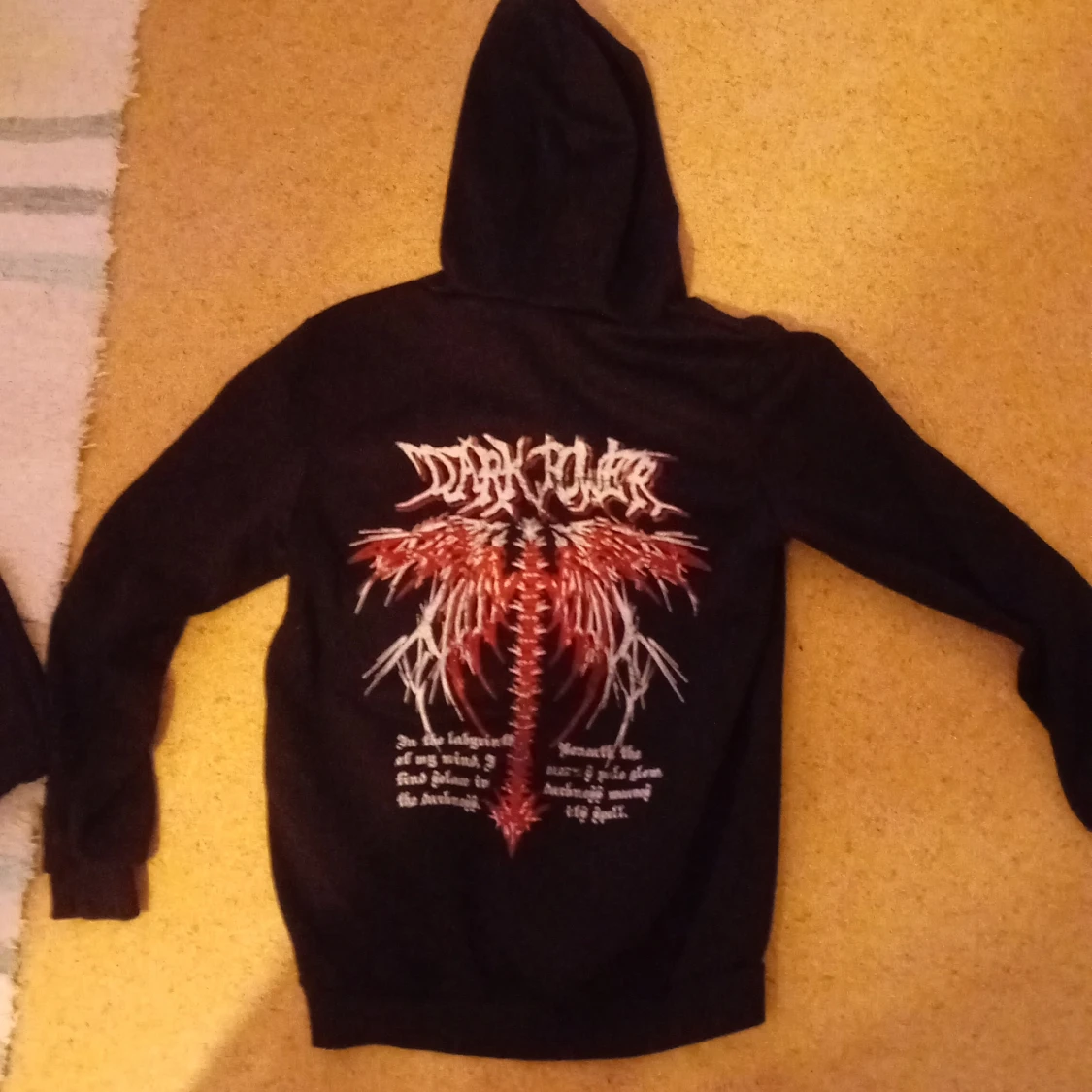 Säljer en svart hoodie från Romwe med tryck i vitt och rött på både fram- och baksidan. Varför jag säljer den är för att jag inte använder den, och den är helt oanvänd, när du köper hoodien så fraktar jag den samma dag.