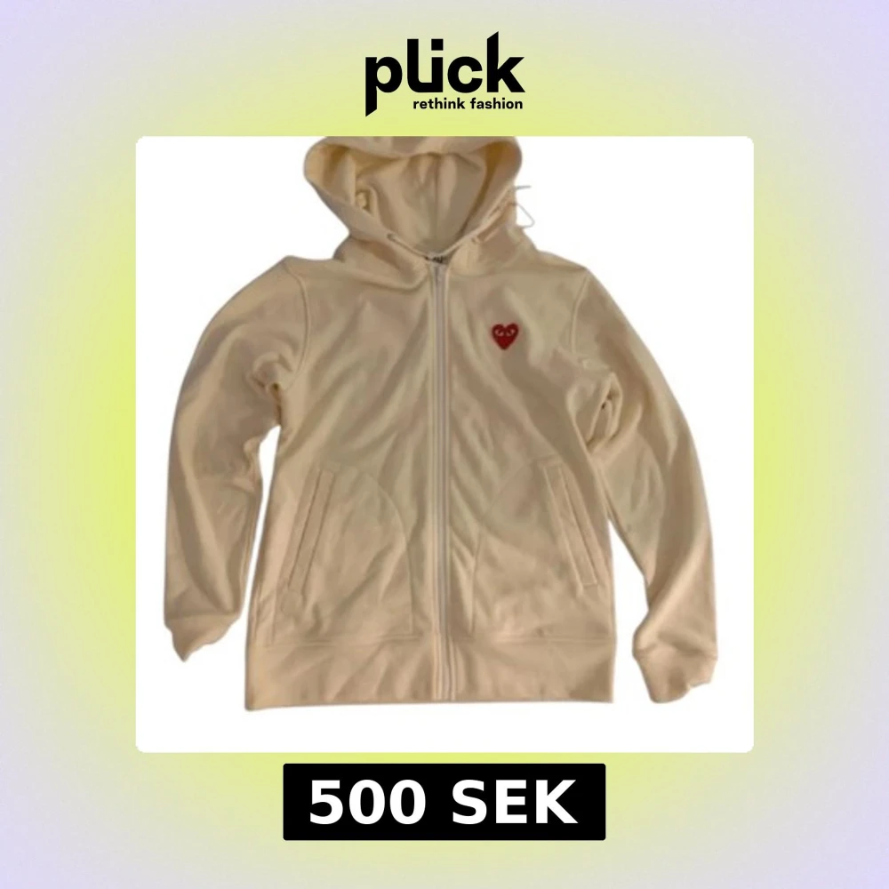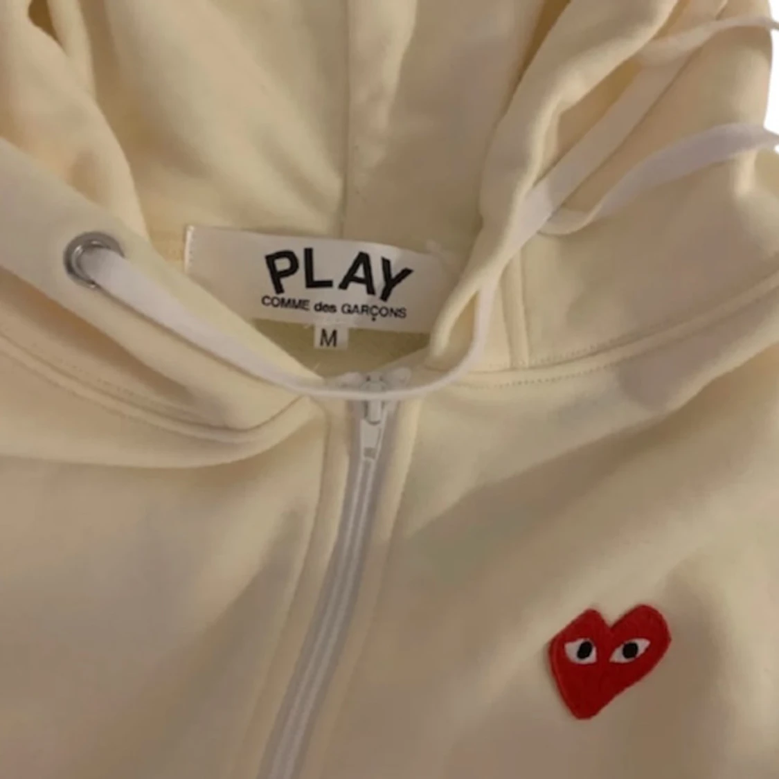 Snygg beige hoodie från Comme des Garçons Play med dragkedja och huva. Tröjan har det ikoniska röda hjärtat broderat på bröstet och praktiska fickor framtill. Perfekt för en chill och stilren look. (Kan gå ner i pris vid snabb affär)