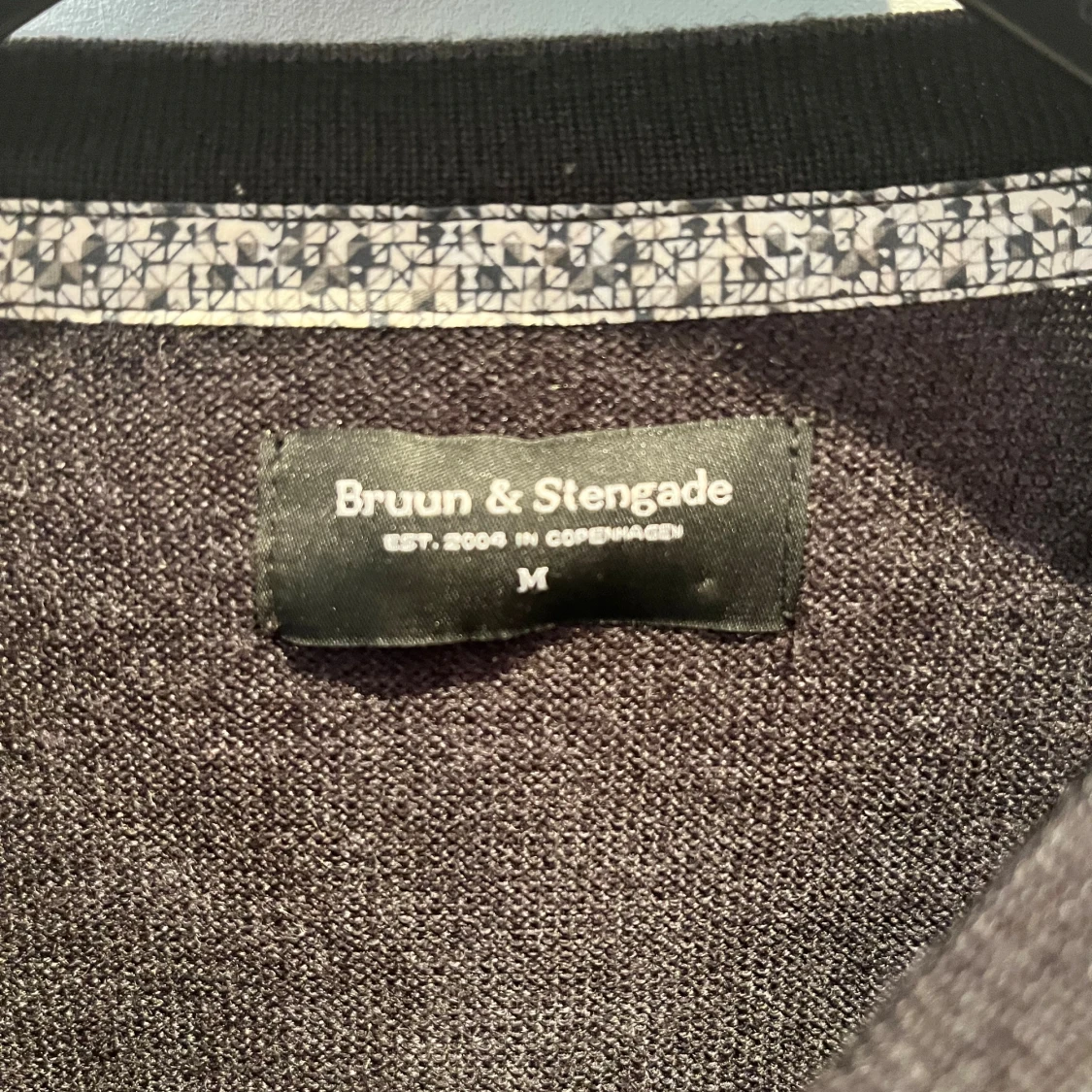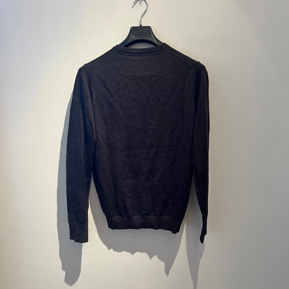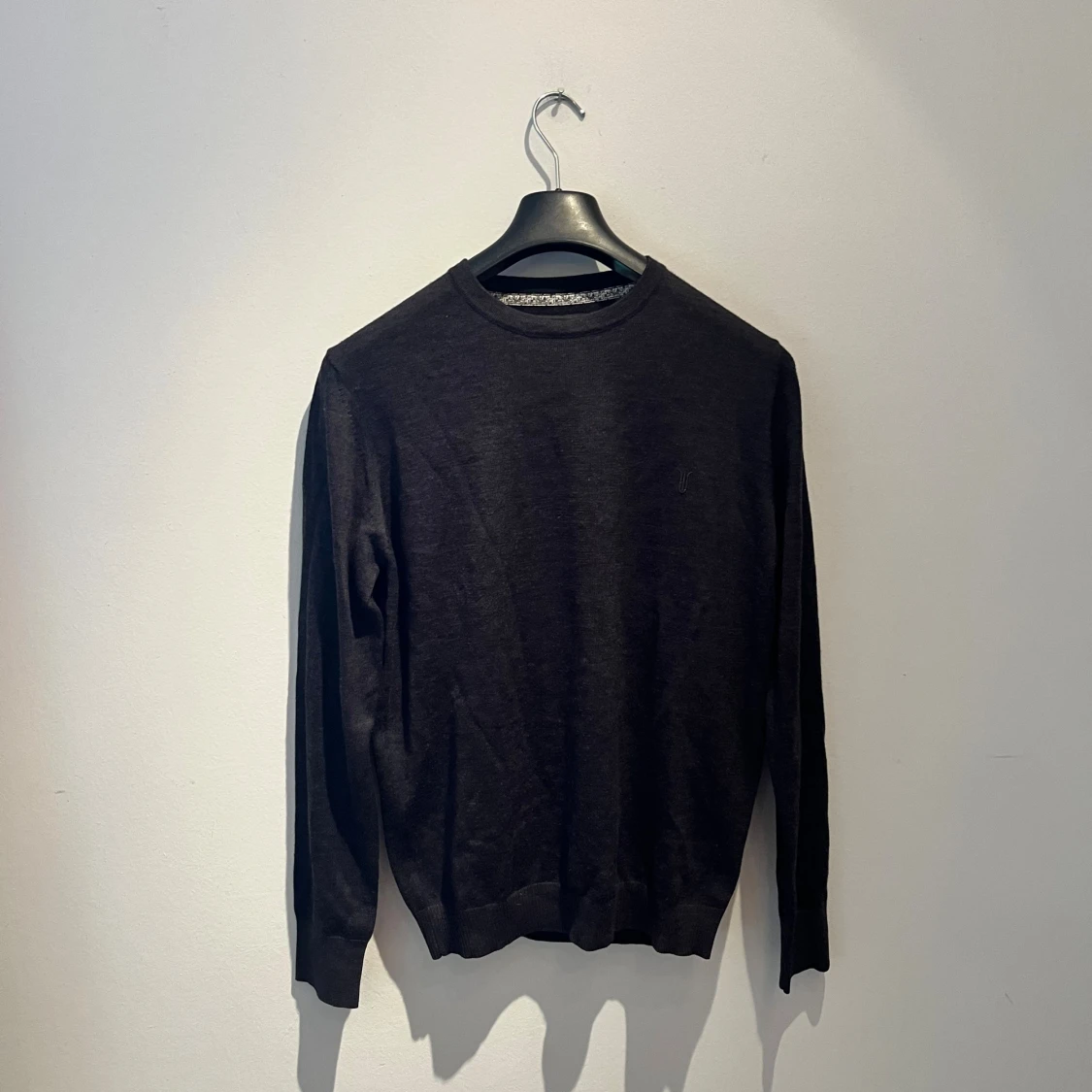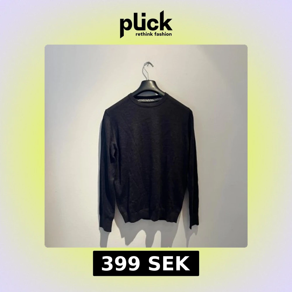 En stilren mörkgrå/svart stickad tröja från Bruun & Stengade i storlek M. Tröjan har rund halsringning och långa ärmar med ribbade muddar. Perfekt för dig som gillar enkel och klassisk design med en snygg passform. Hör av er vid frågor