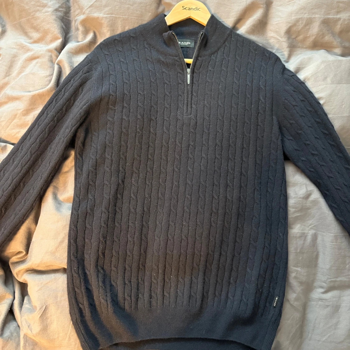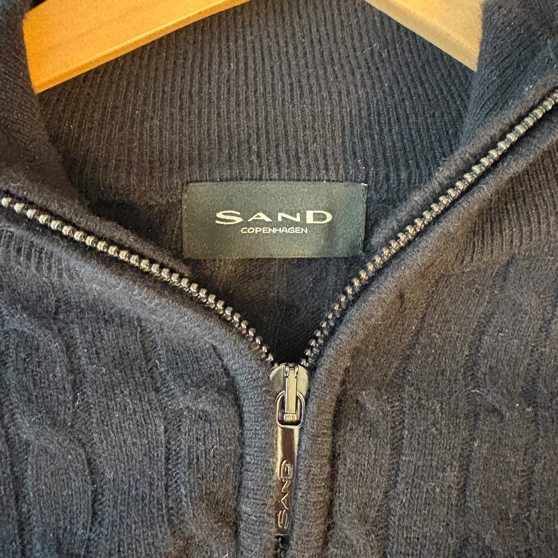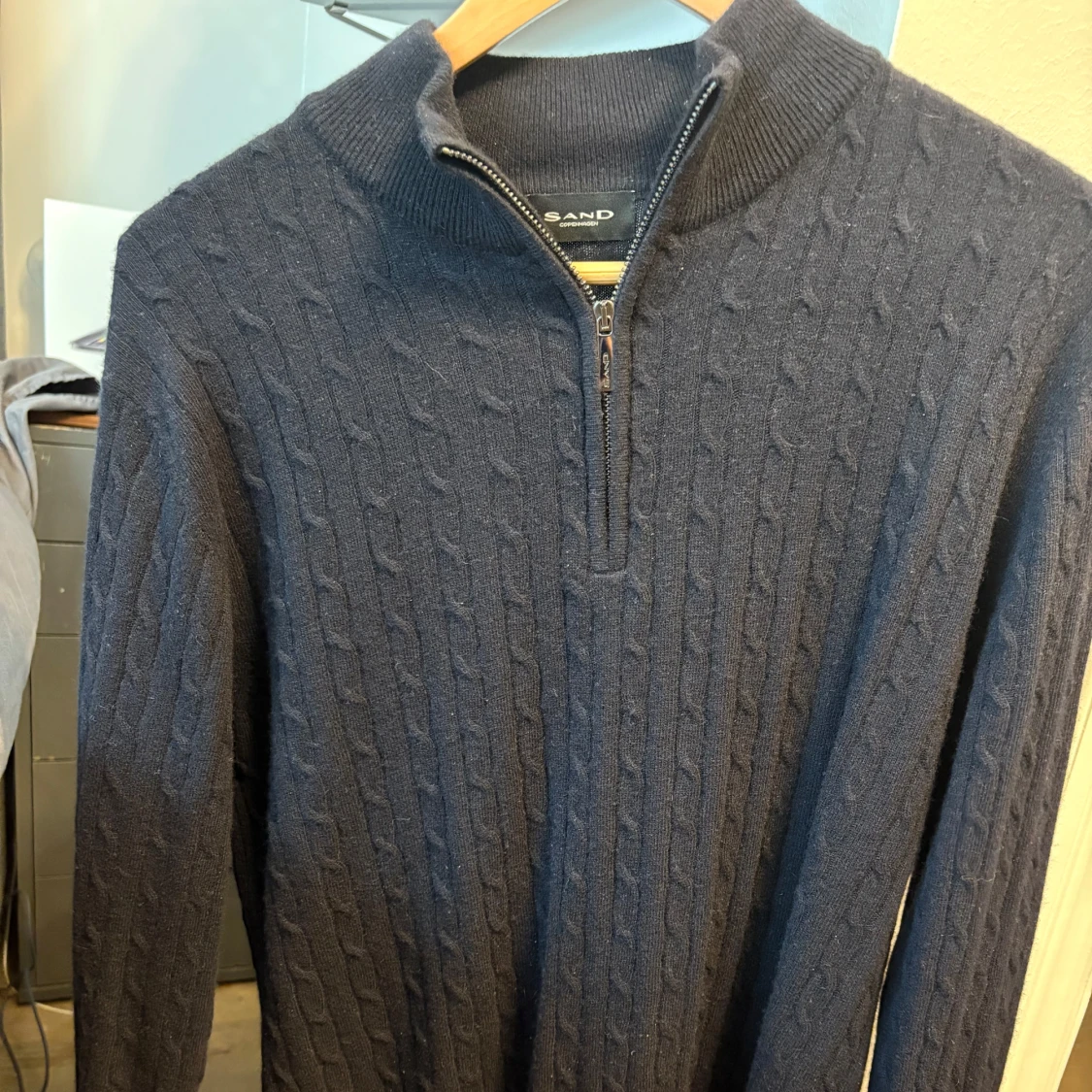 Säljer en mörkblå stickad tröja från Sand med halv dragkedja och kabelstickat mönster. Tröjan har hög krage och långa ärmar, perfekt för kyligare dagar. Cashmere! Pris kan diskuteras