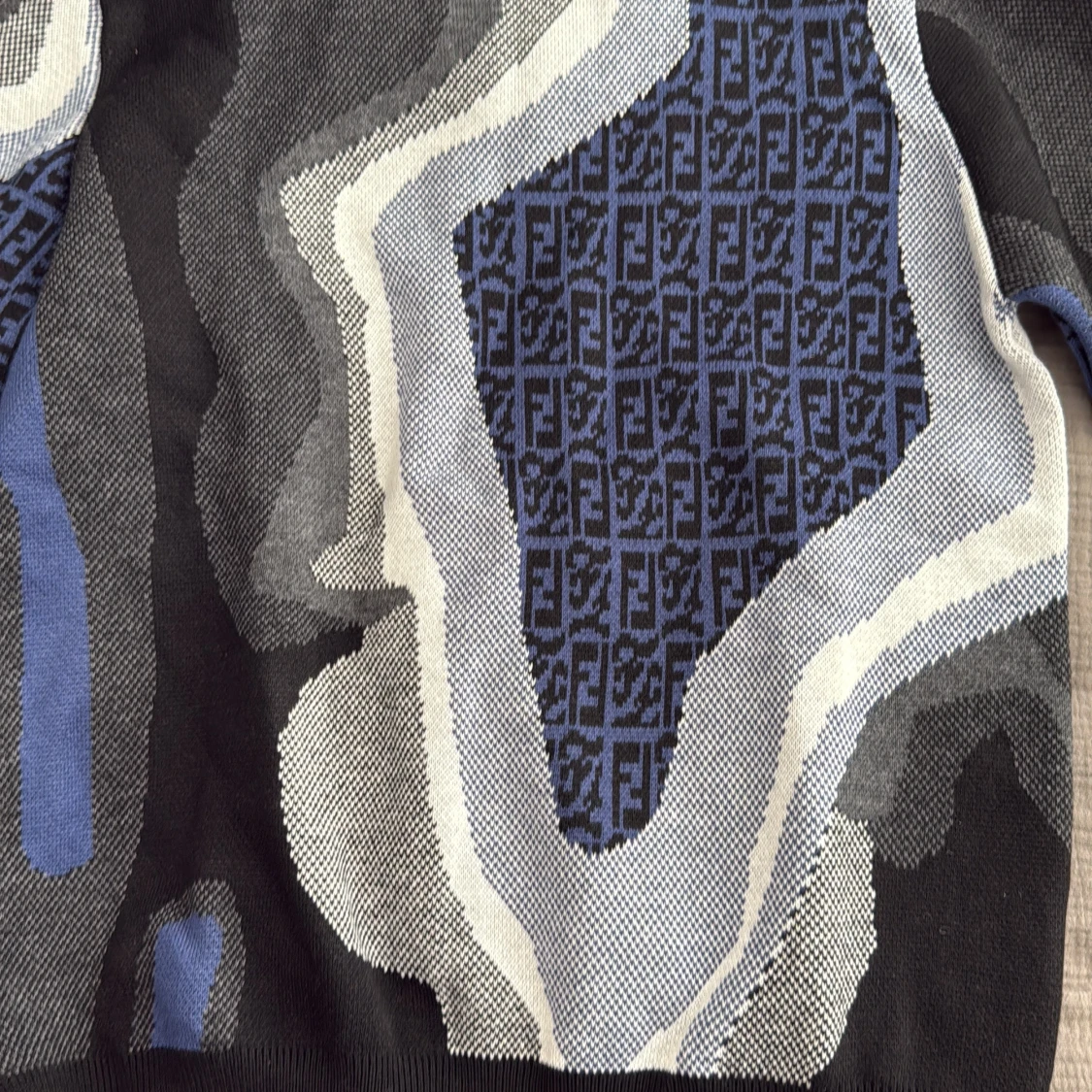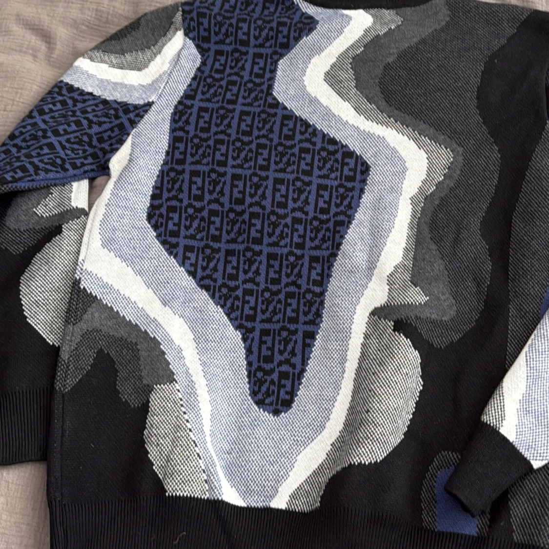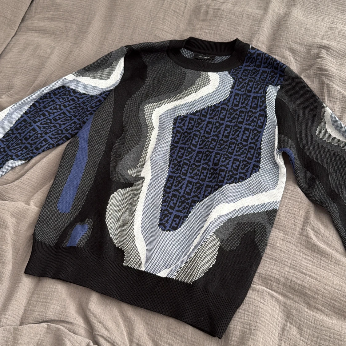 Snygg stickad tröja från Fendi med abstrakt mönster i svart, blått, grått och vitt. Tröjan har rund halsringning och långa ärmar. Fendi-loggan är invävd i det blå partiet på bröstet och ärmarna. Perfekt för dig som gillar statement-plagg.