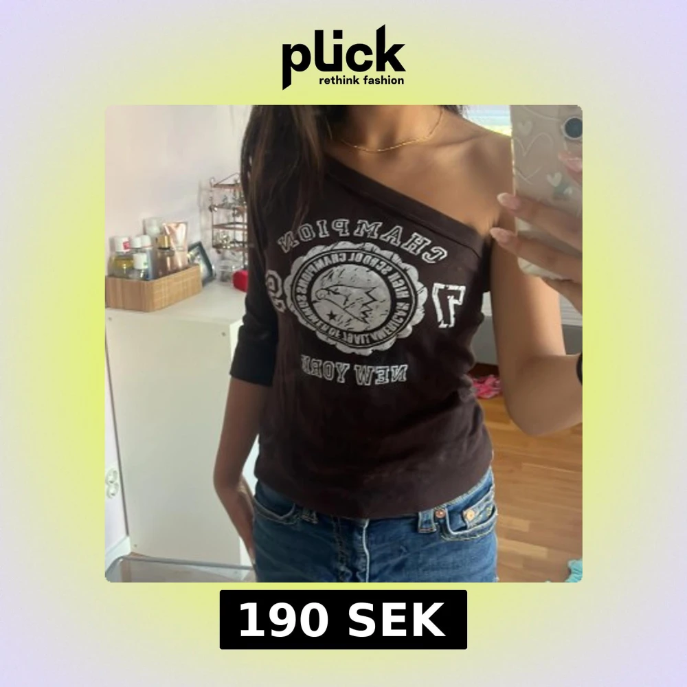 Säljer en brun offshoulder tröja från Sparkz med tryck i vitt framtill. Tröjan har trekvartsärm och en cool, avslappnad passform. Perfekt för dig som gillar sportig och unik stil. Materialet är mjuk bomull som känns skönt mot huden passar mig som är xs