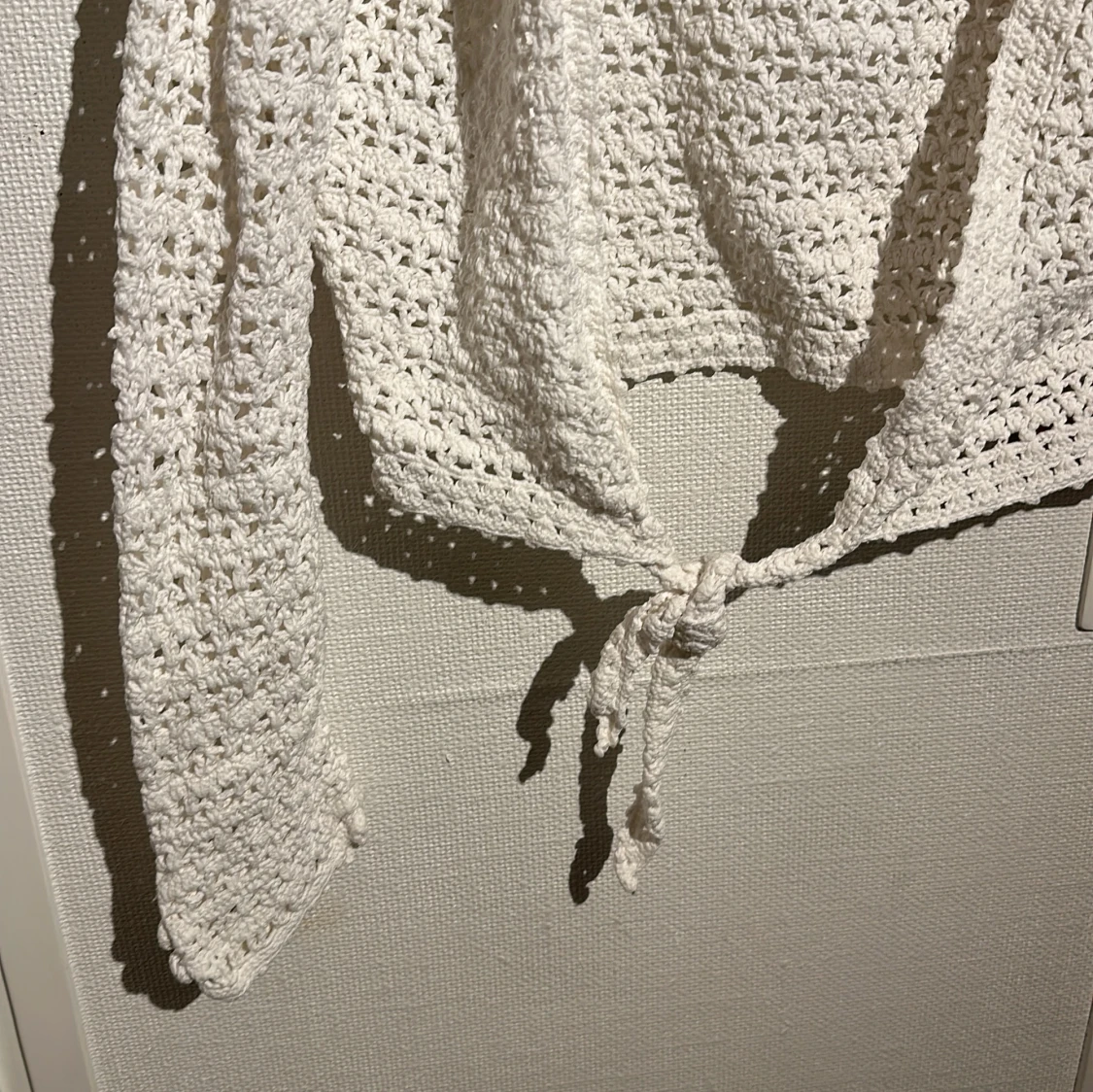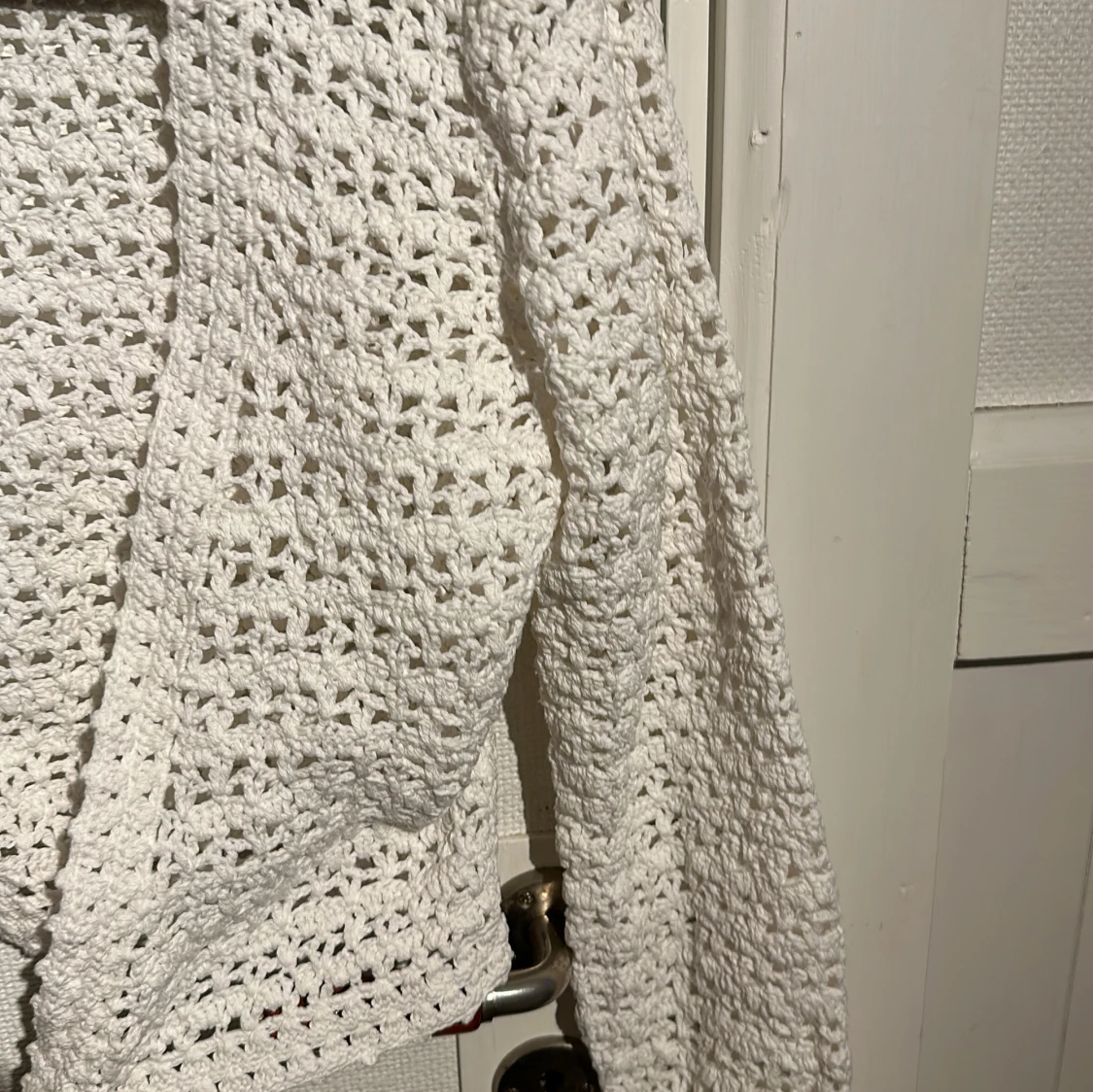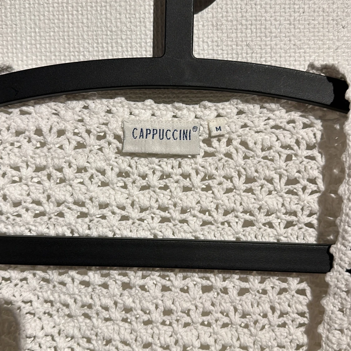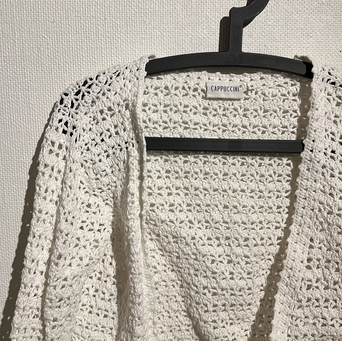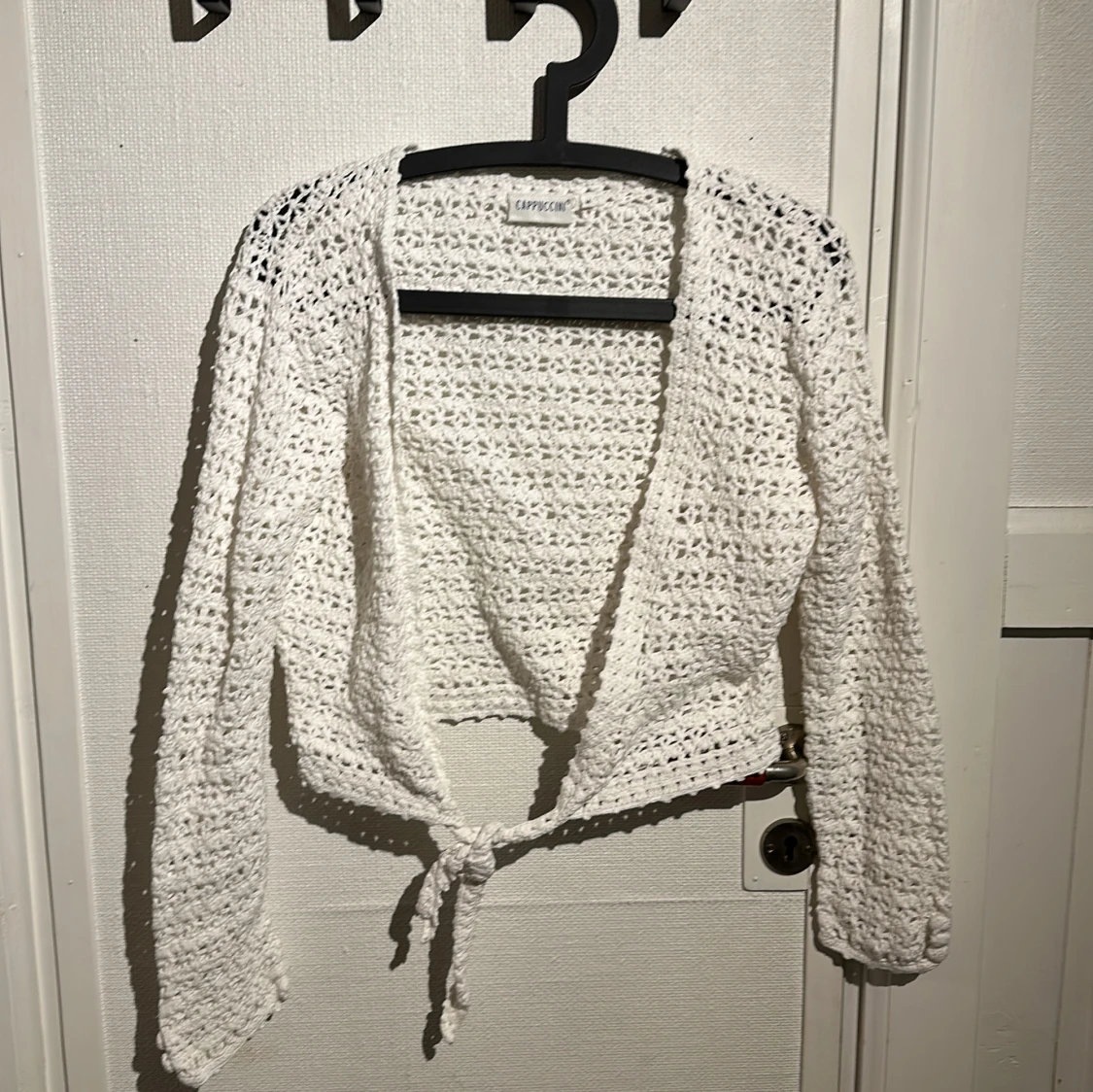 Säljer en söt vit stickad kofta från Cappuccino. Den har en knytning framtill och långa ärmar. Perfekt för en avslappnad stil. Passar bra till både jeans och kjol. 🧶✨