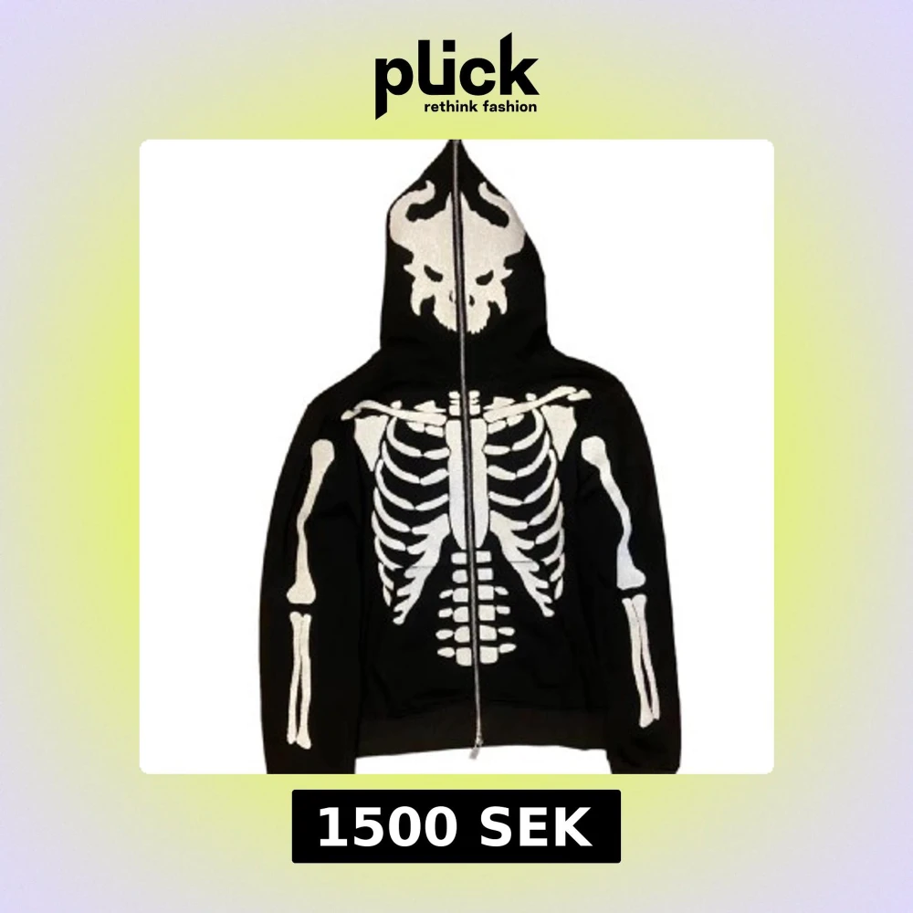 Cool svart hoodie med ett iögonfallande skelettmönster i vitt. Hoodien har en dragkedja framtill och en huva med ett dödskallemotiv. Perfekt för en unik och edgy stil.