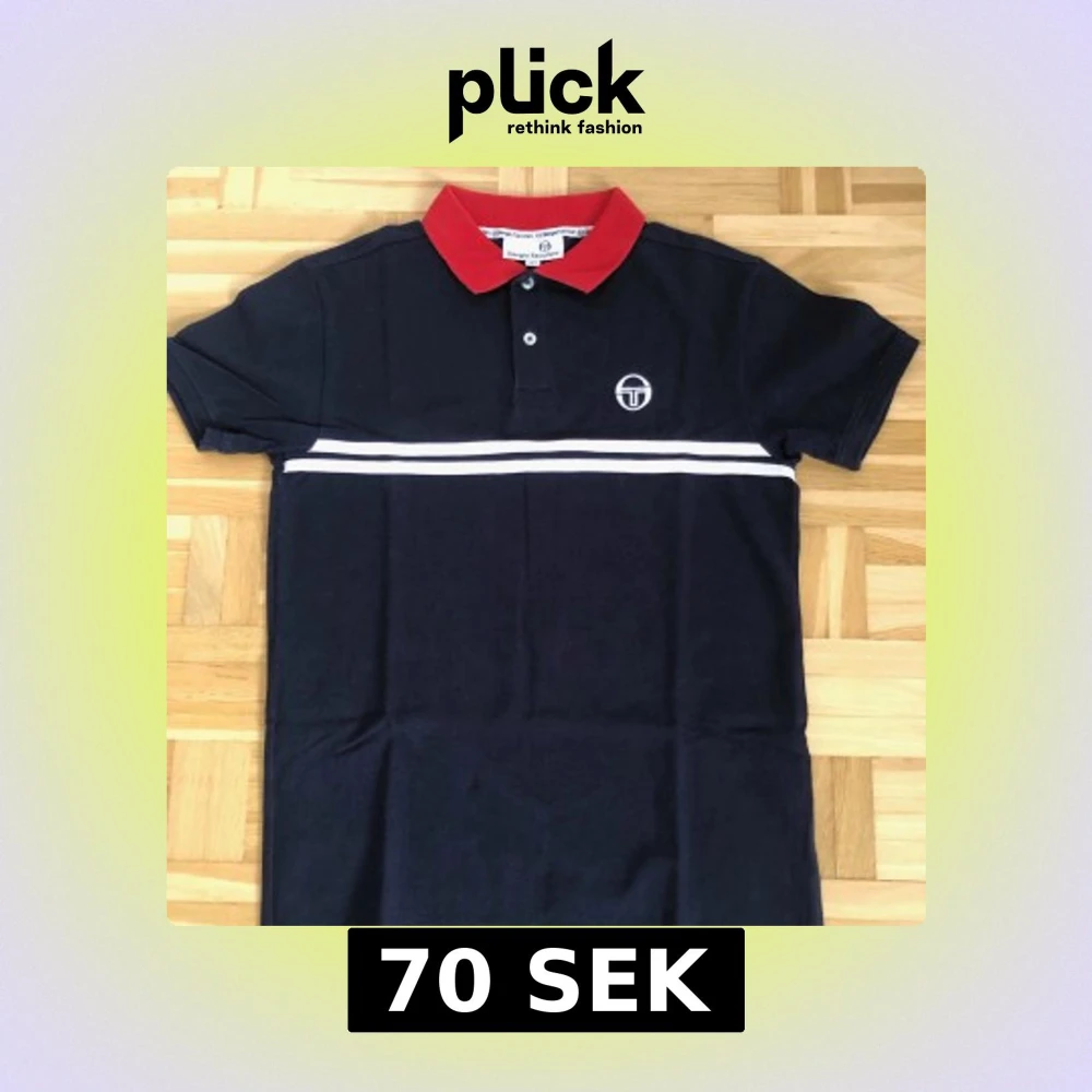Snygg svart pikétröja från Sergio Tacchini med röd krage och vita ränder över bröstet. Tröjan har korta ärmar och en klassisk pikédesign med knappar framtill. Perfekt för en sportig och stilren look.
