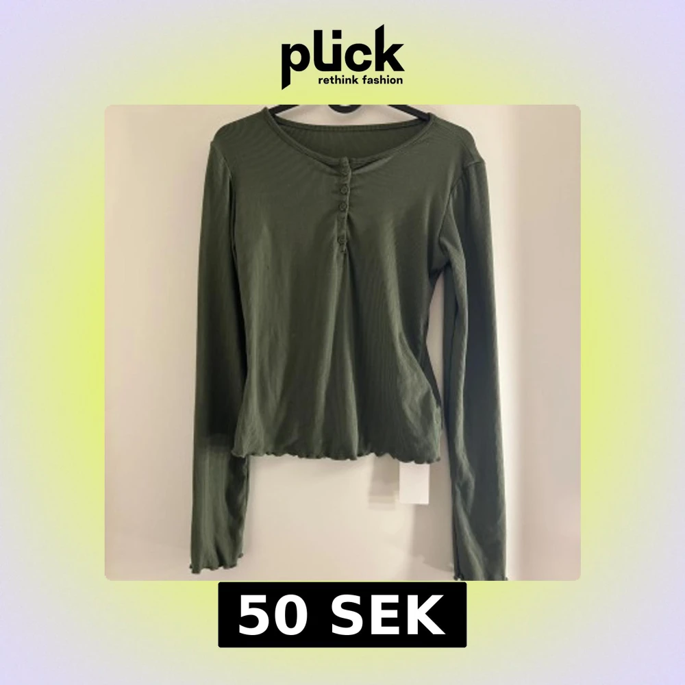 Säljer en olivgrön ribbad topp med långa ärmar och knappar framtill. Toppen har en croppad design och är perfekt för lager-på-lager-stil. Passar bra till både jeans och kjol.