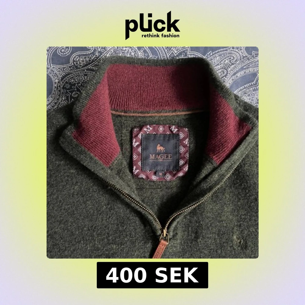 Snygg mörkgrön stickad half zip från Magee. Storlek M men sitter kanske mer som en S. 100 procent lammull och nypris kanske 1500. Bra skick men har en liten liten lagning i ena armhålan, men inget som syns.