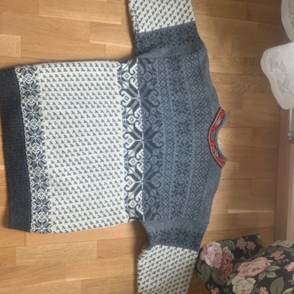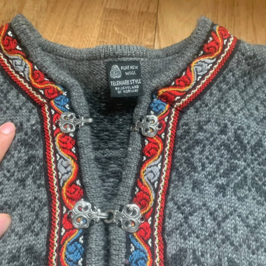 Traditionell norsk stickad tröja i Telemark-stil från Skjeveland. Grå och vit med snyggt mönster, broderad kant i rött, blått och gult samt metallspännen vid halsen. Tillverkad i ren ny ull, långärmad och perfekt för kalla dagar.