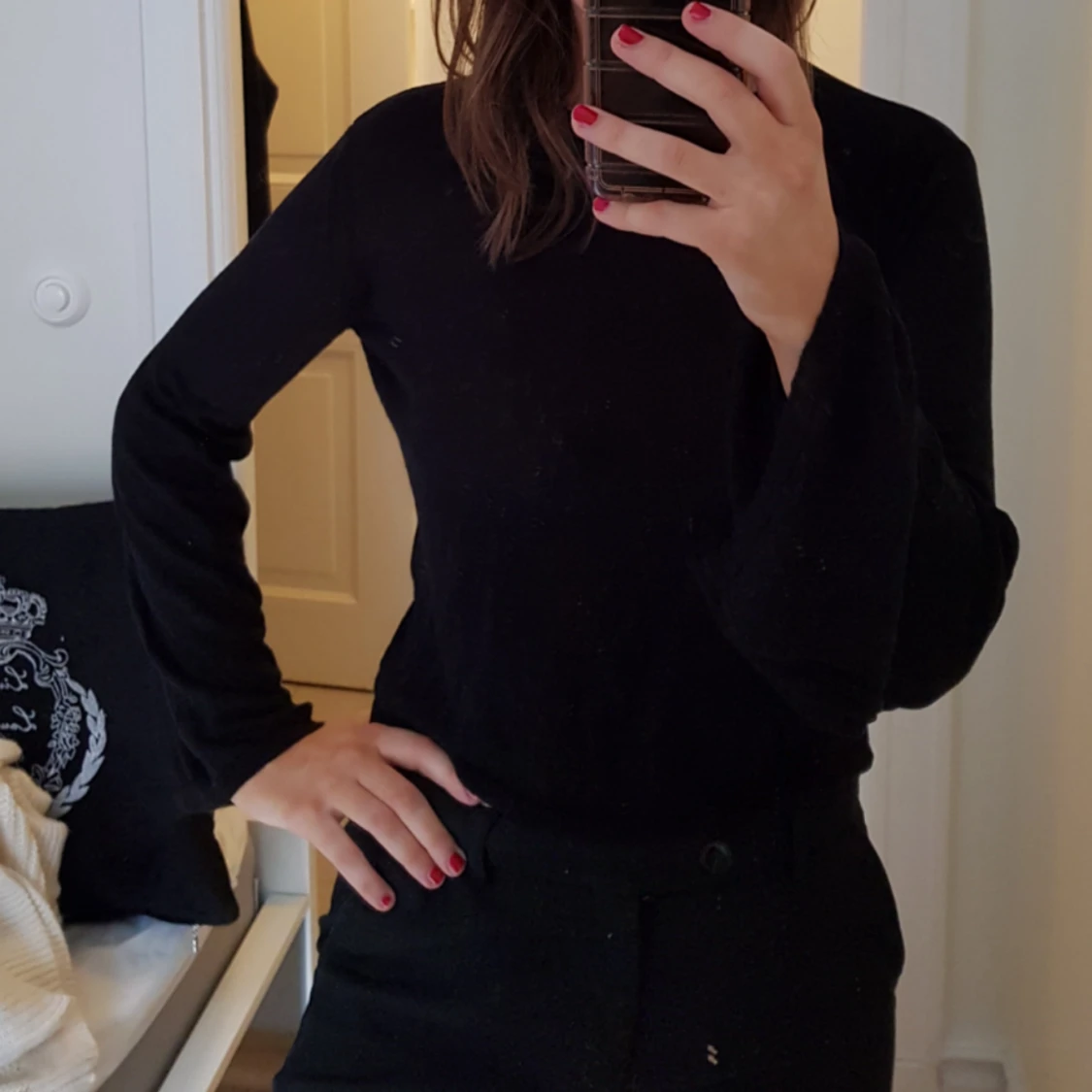 Svart långärmad tröja från Mango. Lång i ärmarna, tunt sydd men inte så man ser igenom! Använd en sommarkväll under en klänning:)