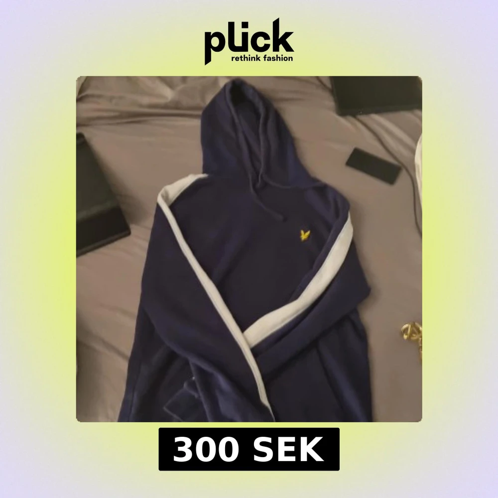 Snygg marinblå hoodie från Lyle & Scott med vit rand längs ärmarna och klassisk gul logga på bröstet. Tröjan har huva med snörning och är tillverkad i mjuk bomull. Den har en liten skada vid magfickan
