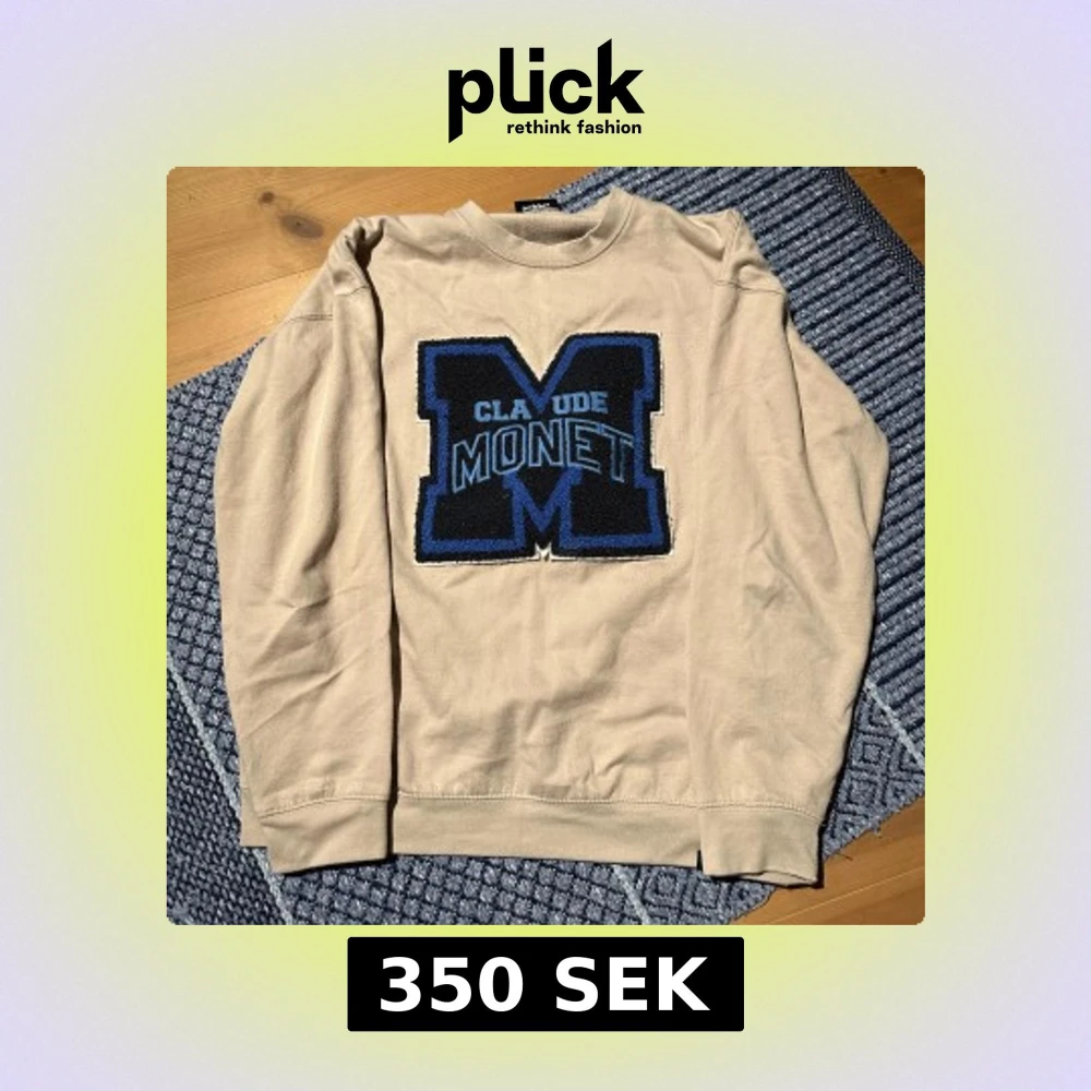Beige sweatshirt från Vintage Supply med stort blått och svart 'M' och Claude Monet-tryck framtill. Baksidan har ett färgglatt motiv inspirerat av Monets konst. Mjuk bomullskänsla och långärmad modell.