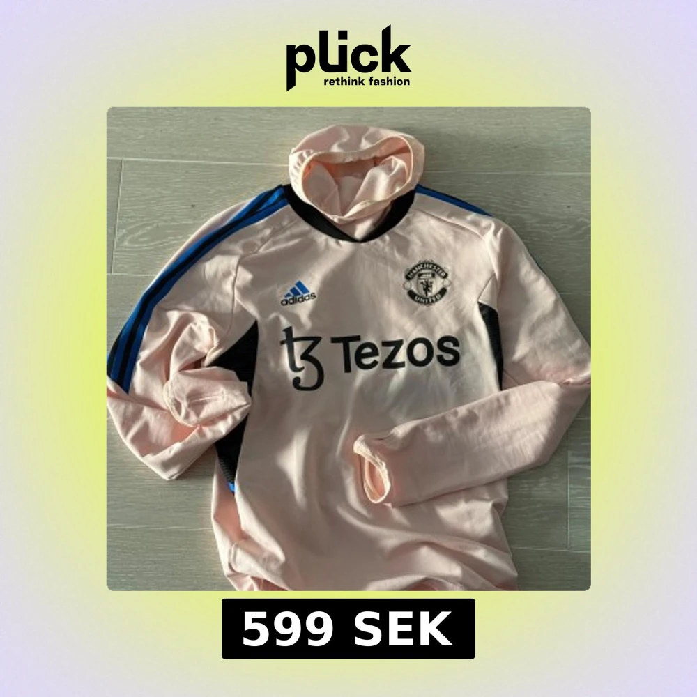 Säljer en snygg rosa Manchester United tröja från Adidas med blå detaljer och klubbens logga på bröstet. Tröjan är tillverkad av Parley Ocean Plastic och har en modern design med långa ärmar. Perfekt för alla United-fans! 🌟