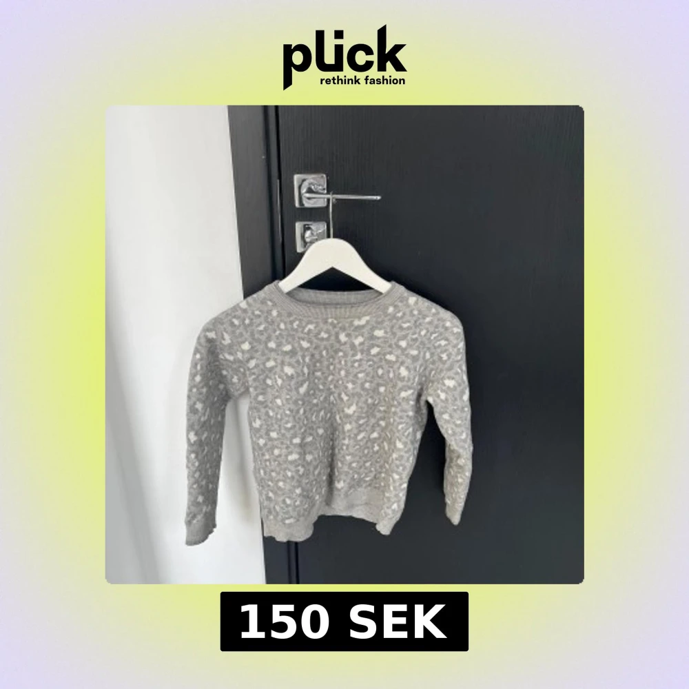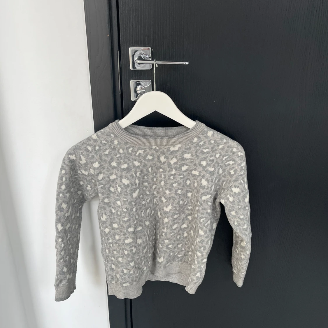 Säljer en mysig grå stickad tröja med leopardmönster. Tröjan har långa ärmar och en rund halsringning. Perfekt för kyliga dagar.