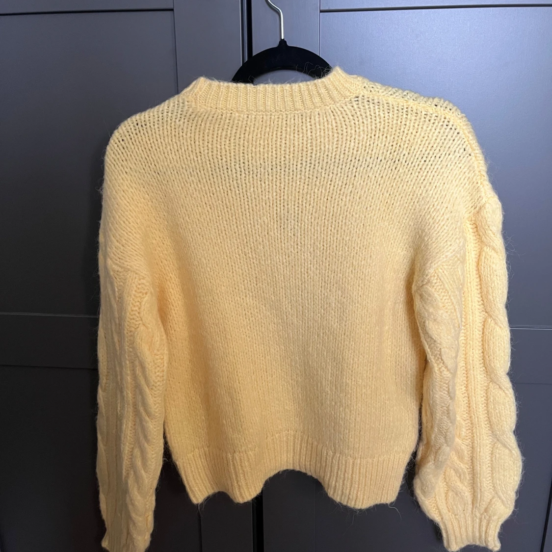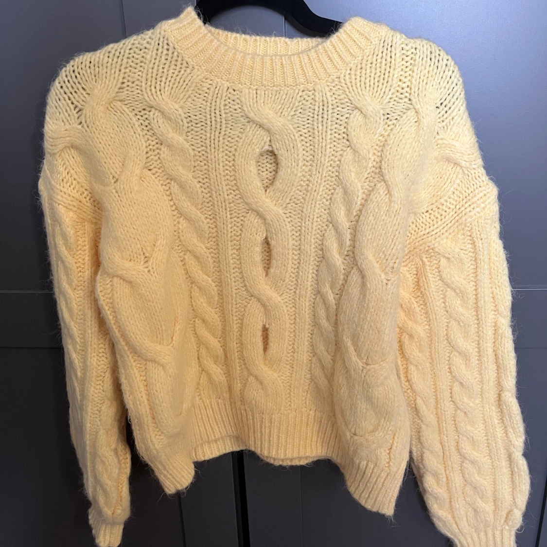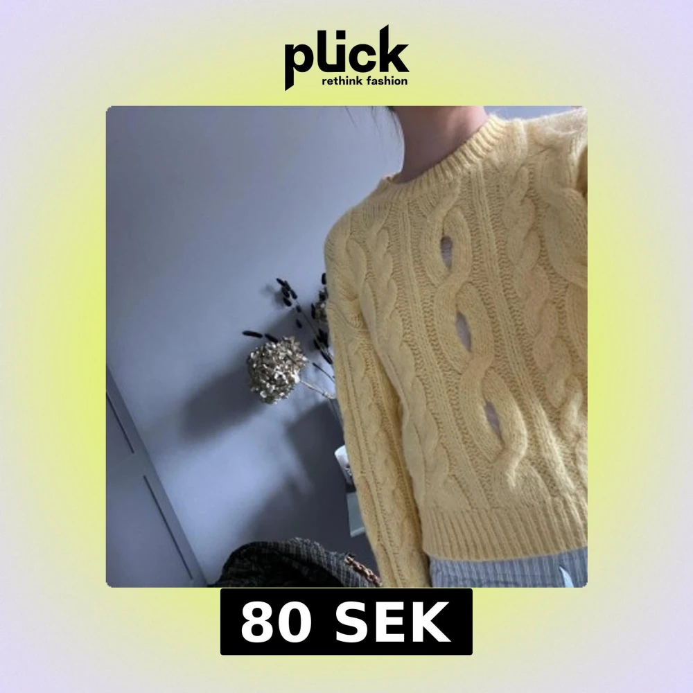 Säljer en söt gul stickad tröja med grovt flätmönster och rund hals. Tröjan har långa ärmar och ribbade muddar vid ärmslut och nederkant. Perfekt för lager-på-lager och ger en mysig känsla.
