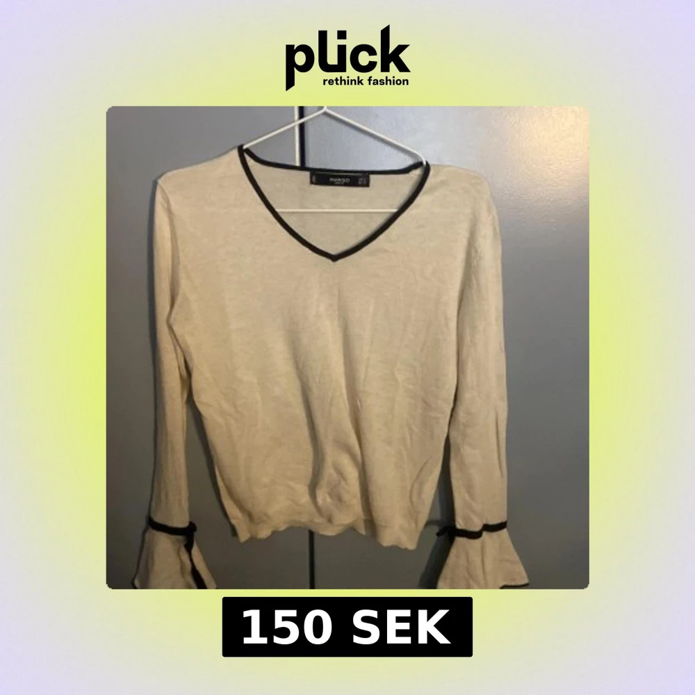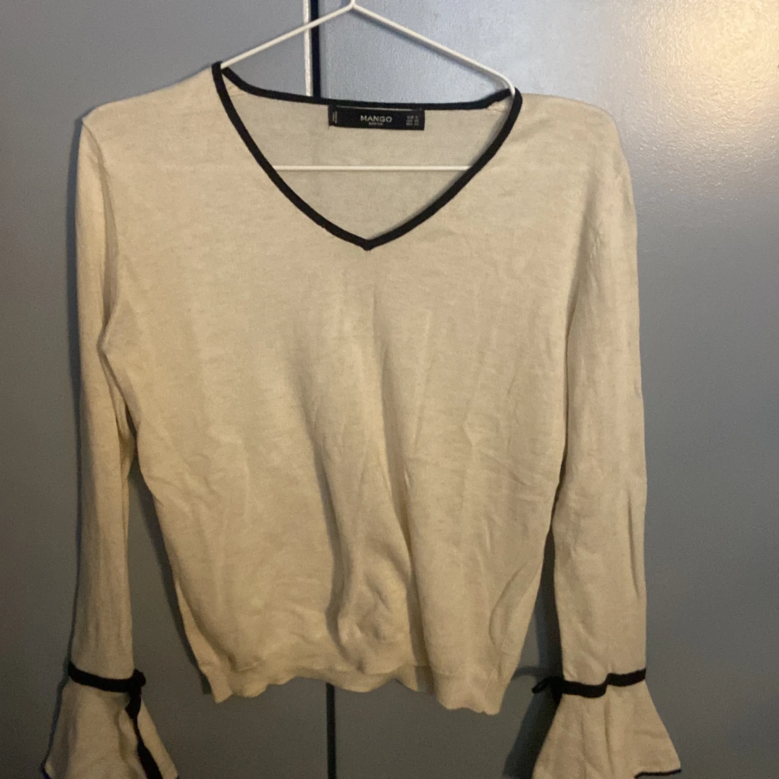 Säljer en beige långärmad topp från Mango med svarta detaljer vid v-ringning och ärmslut. Toppen har volangdetaljer vid ärmslut och en mjuk, tunn känsla.