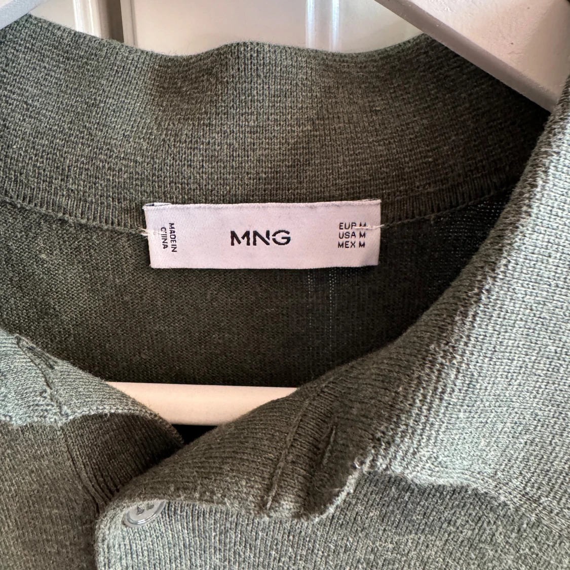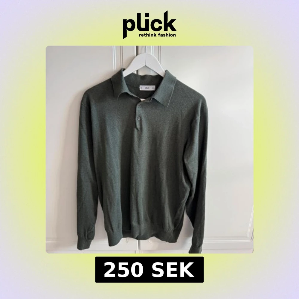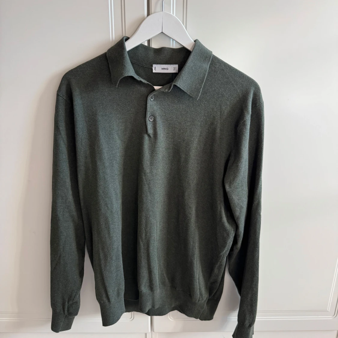 Säljer en stilren grön stickad pikétröja från Mangons. Tröjan har klassisk krage, knäppning med två knappar och långa ärmar. Perfekt för en avslappnad men ändå uppklädd look.