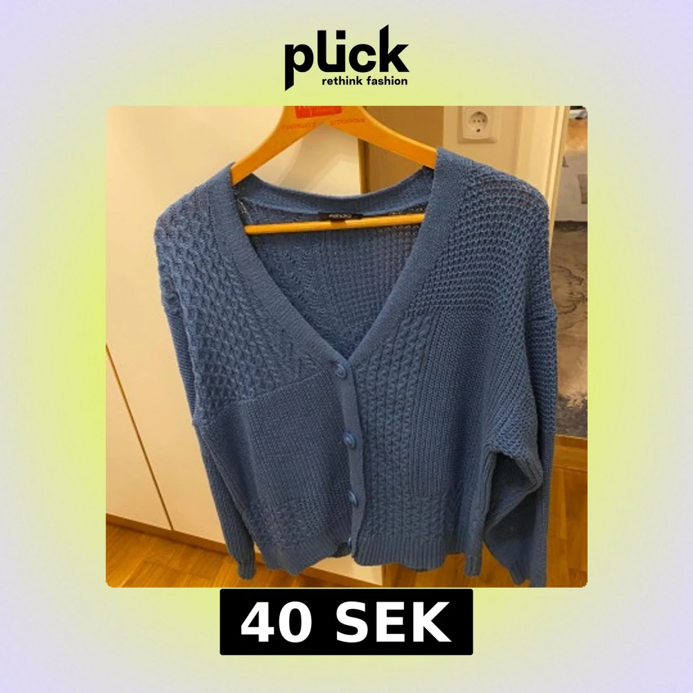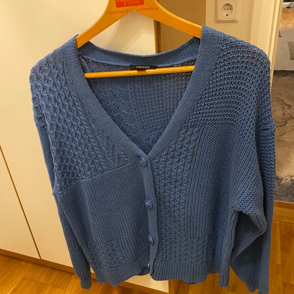 Säljer en blå stickad kofta från Mango med v-ringning och knappar framtill. Koftan har en fin strukturstickning och långa ärmar. Perfekt för kyliga dagar!