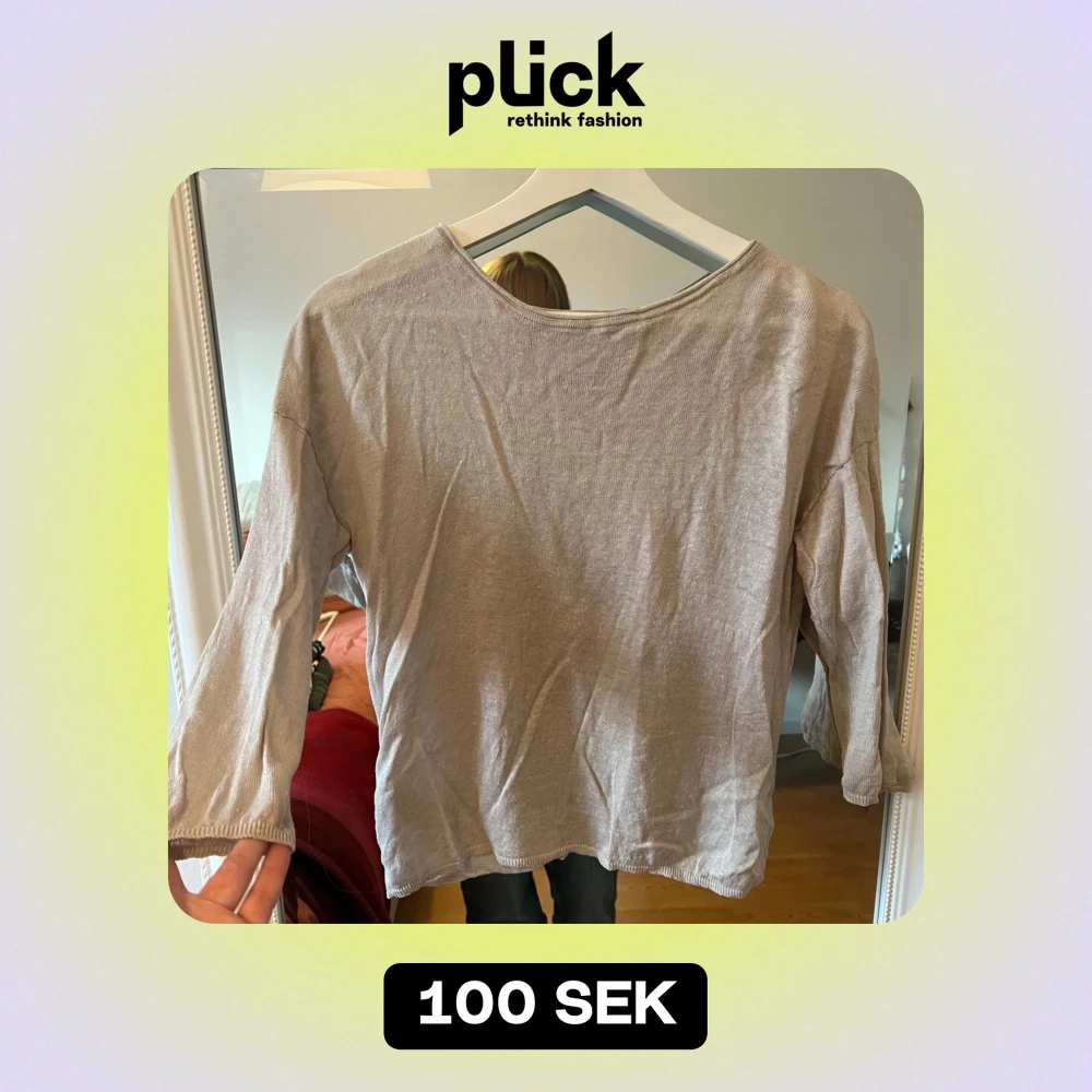 Säljer en snygg beige tröja med omlott-design på baksidan. Den har trekvartsärmar och är perfekt för både vår och höst. Materialet känns mjukt och bekvämt, vilket gör den idealisk för vardagsbruk. Passar bra till jeans eller kjol för en avslappnad look.