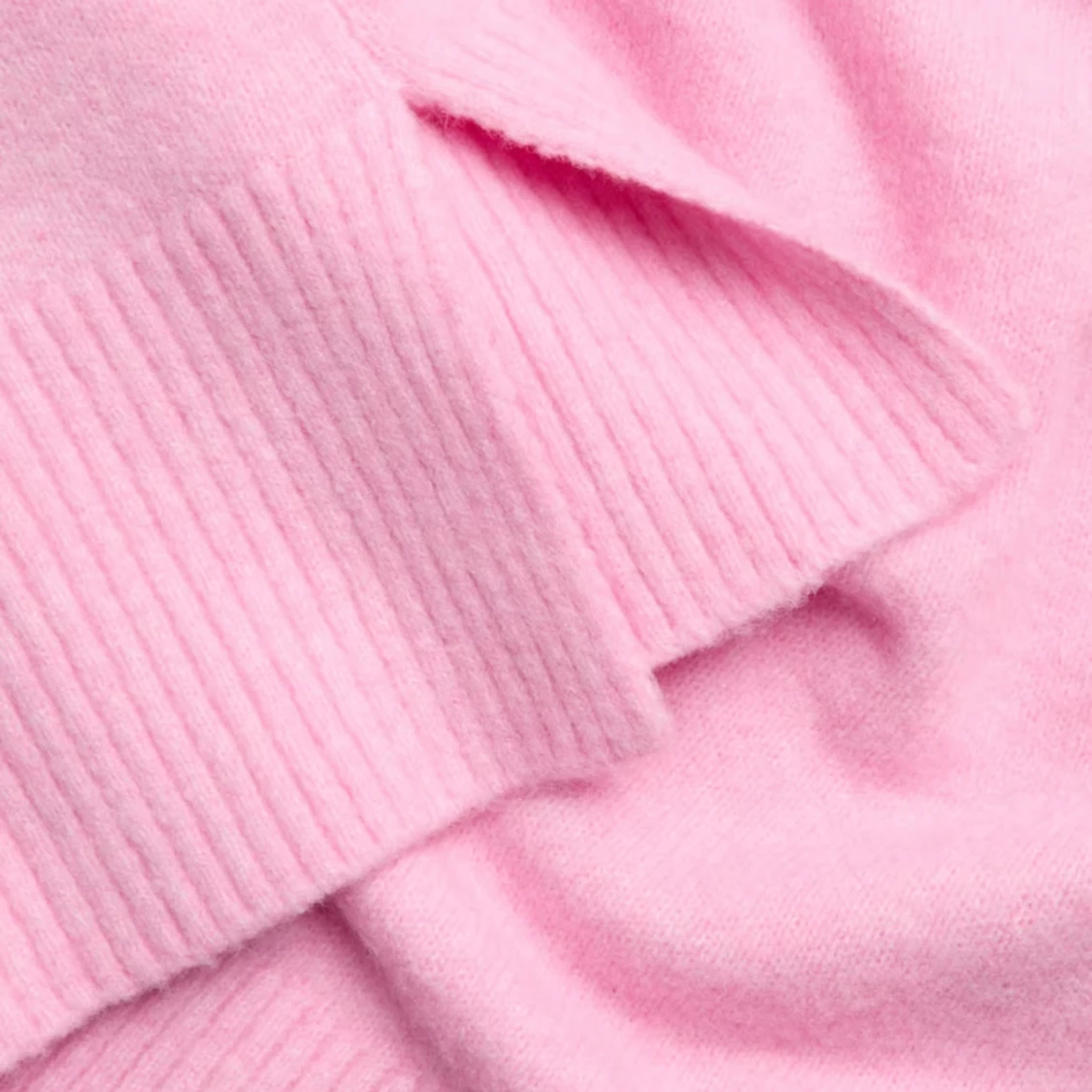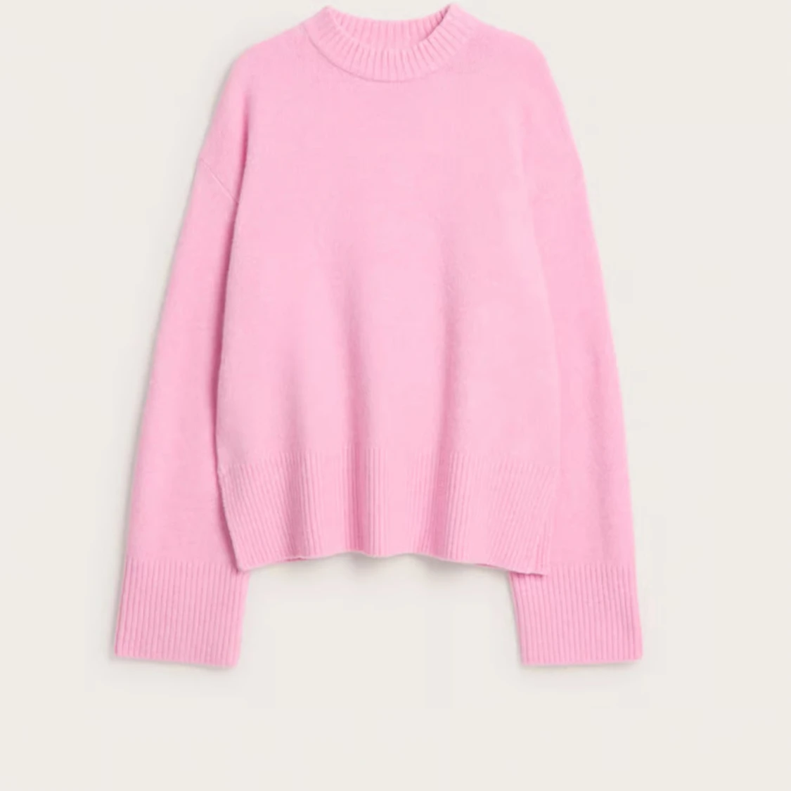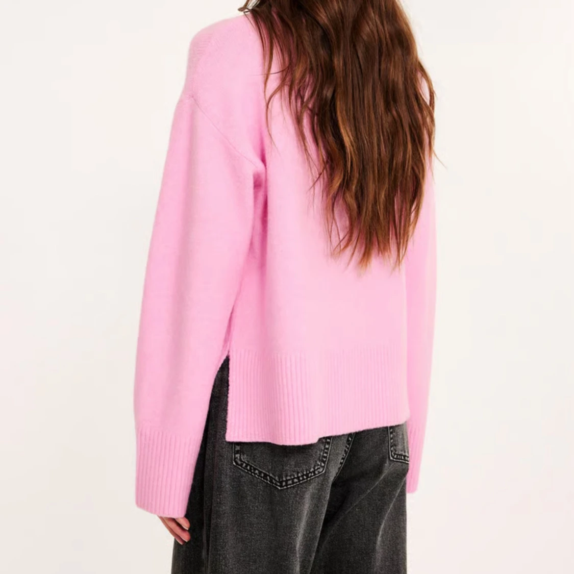 Supermysig ljusrosa stickad tröja från Mango med ribbad hals, muddar och nederkant. Tröjan har en loose passform och långa ärmar, perfekt för att ge en chill vibe till din outfit. Materialet är mjukt och känns skönt mot huden.
