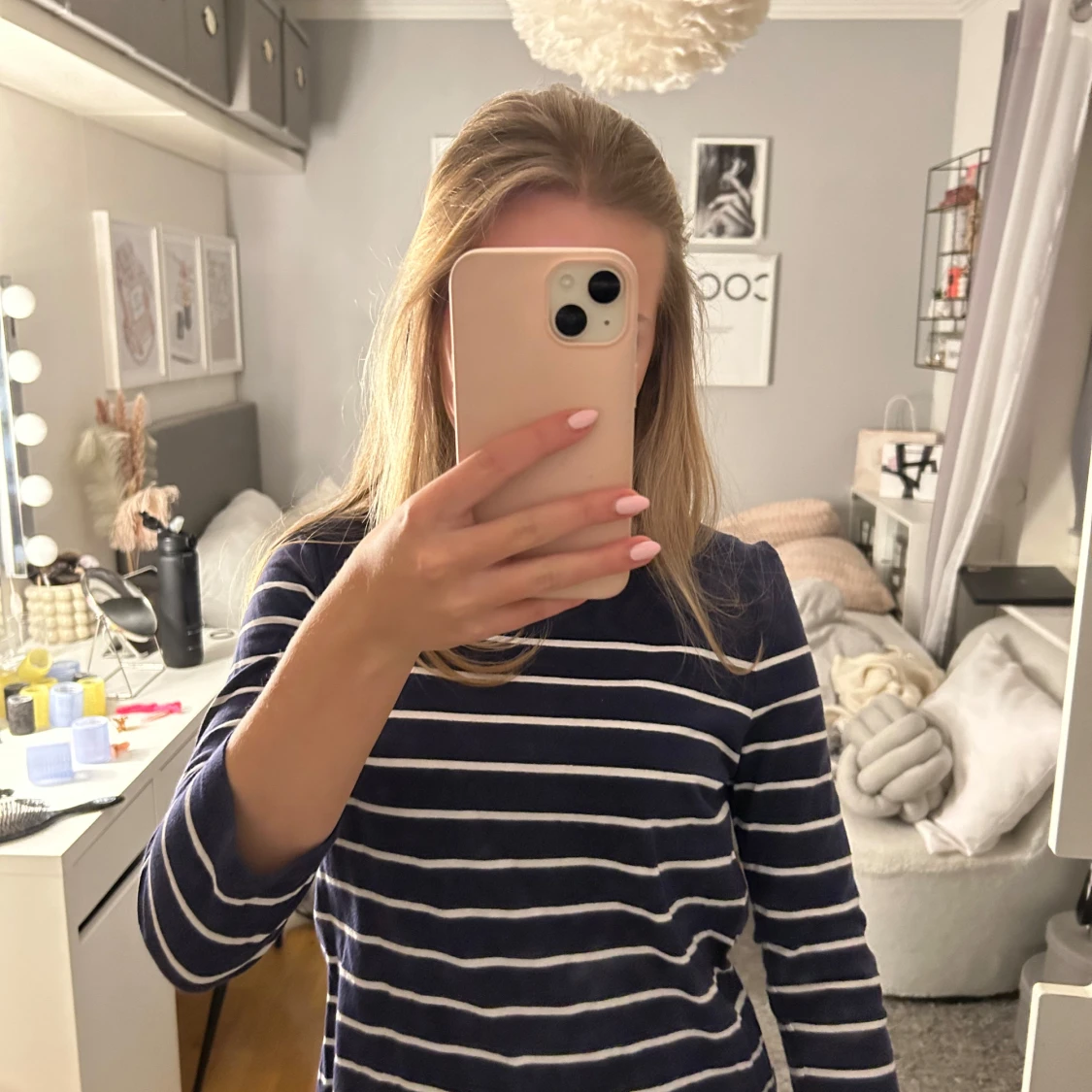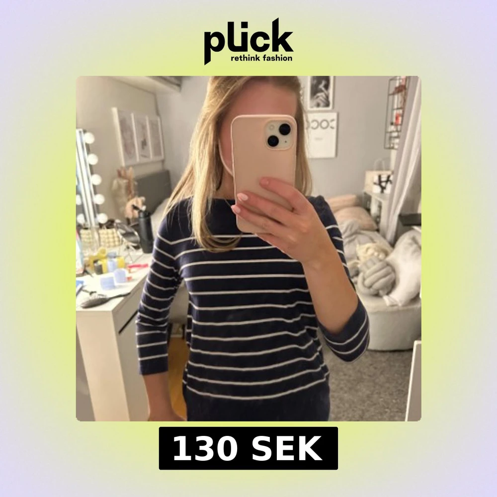 Säljer en snygg mörkblå tröja med vita ränder. Tröjan har trekvartsärmar och en klassisk design som passar perfekt till vardags. Perfekt för dig som gillar en stilren look!