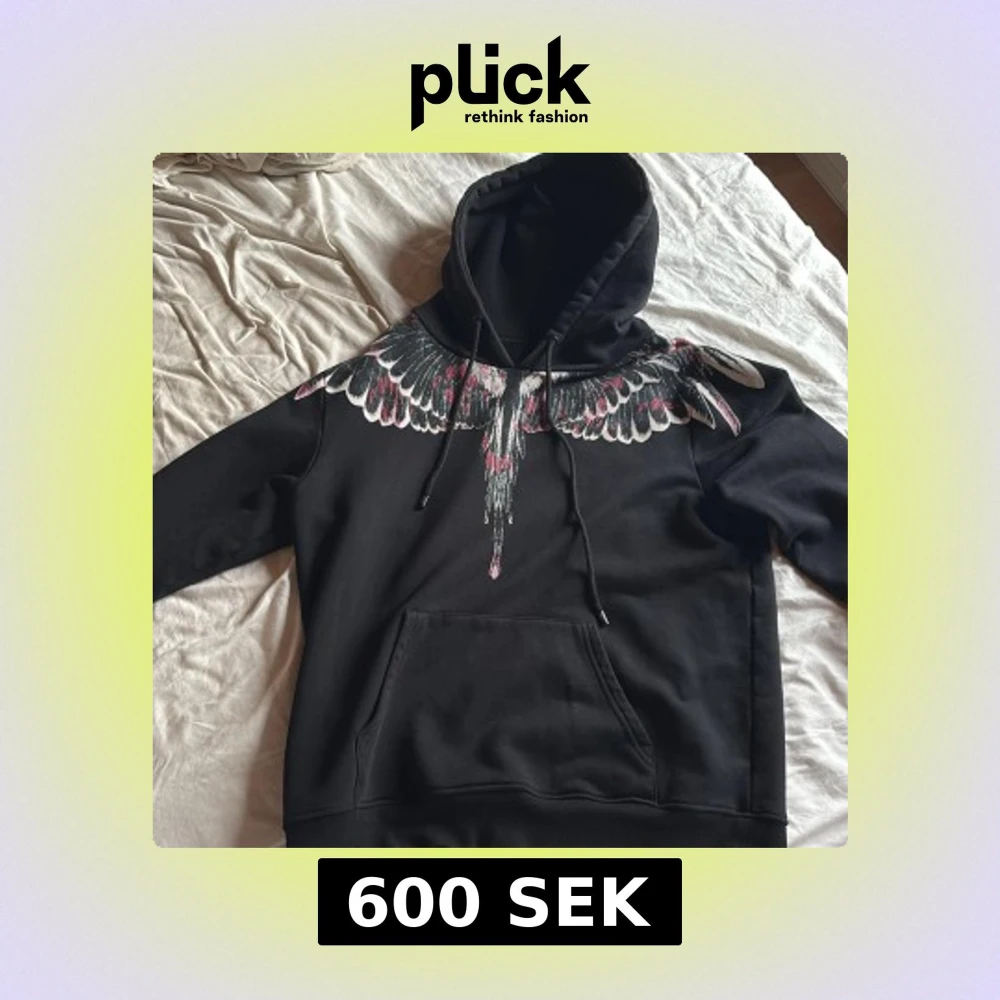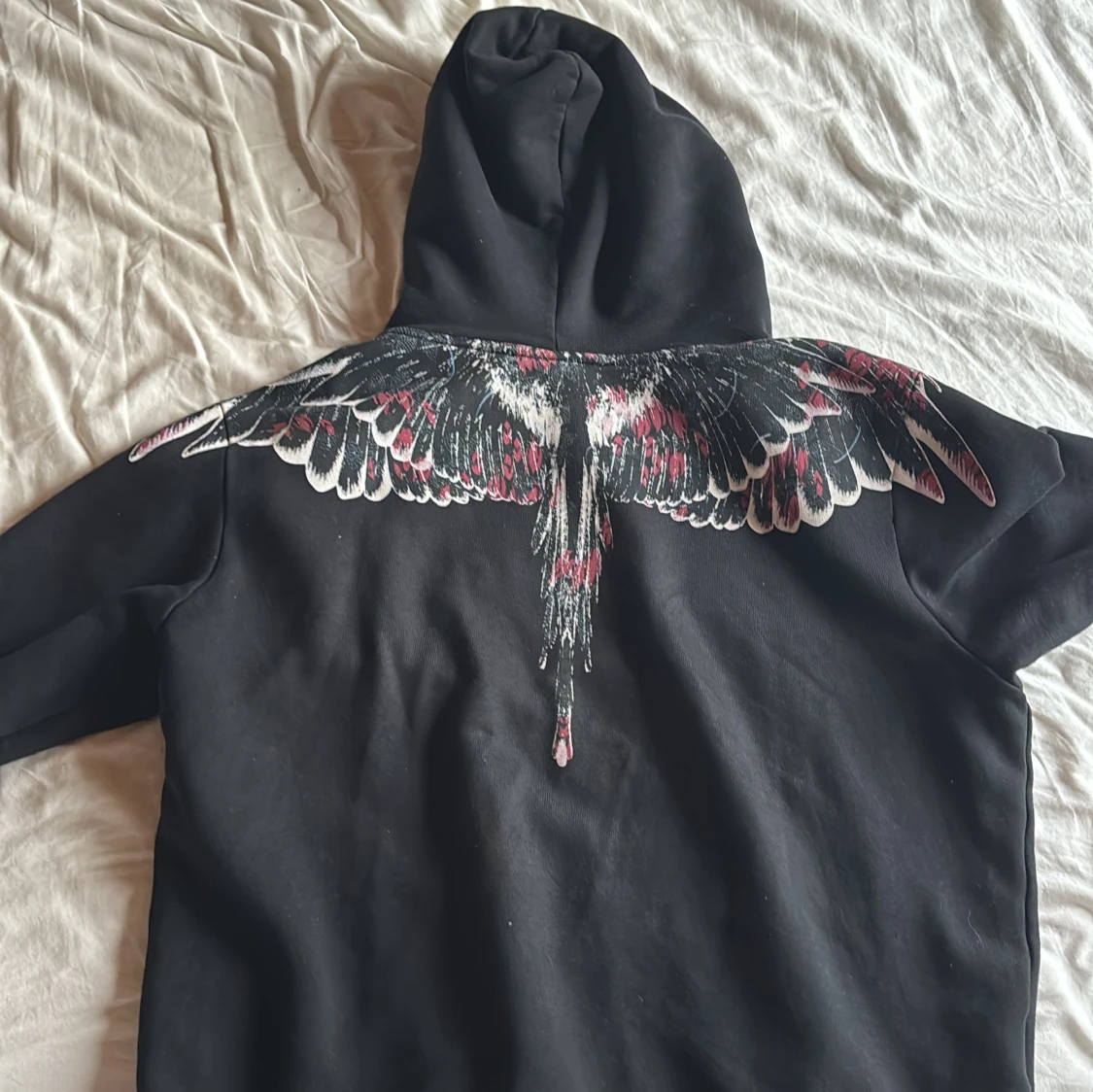 Marcelo burlon hoodie svart, storlek S. Snygga detaljer och en svart färg som passar perfekt nu till hösten/vintern